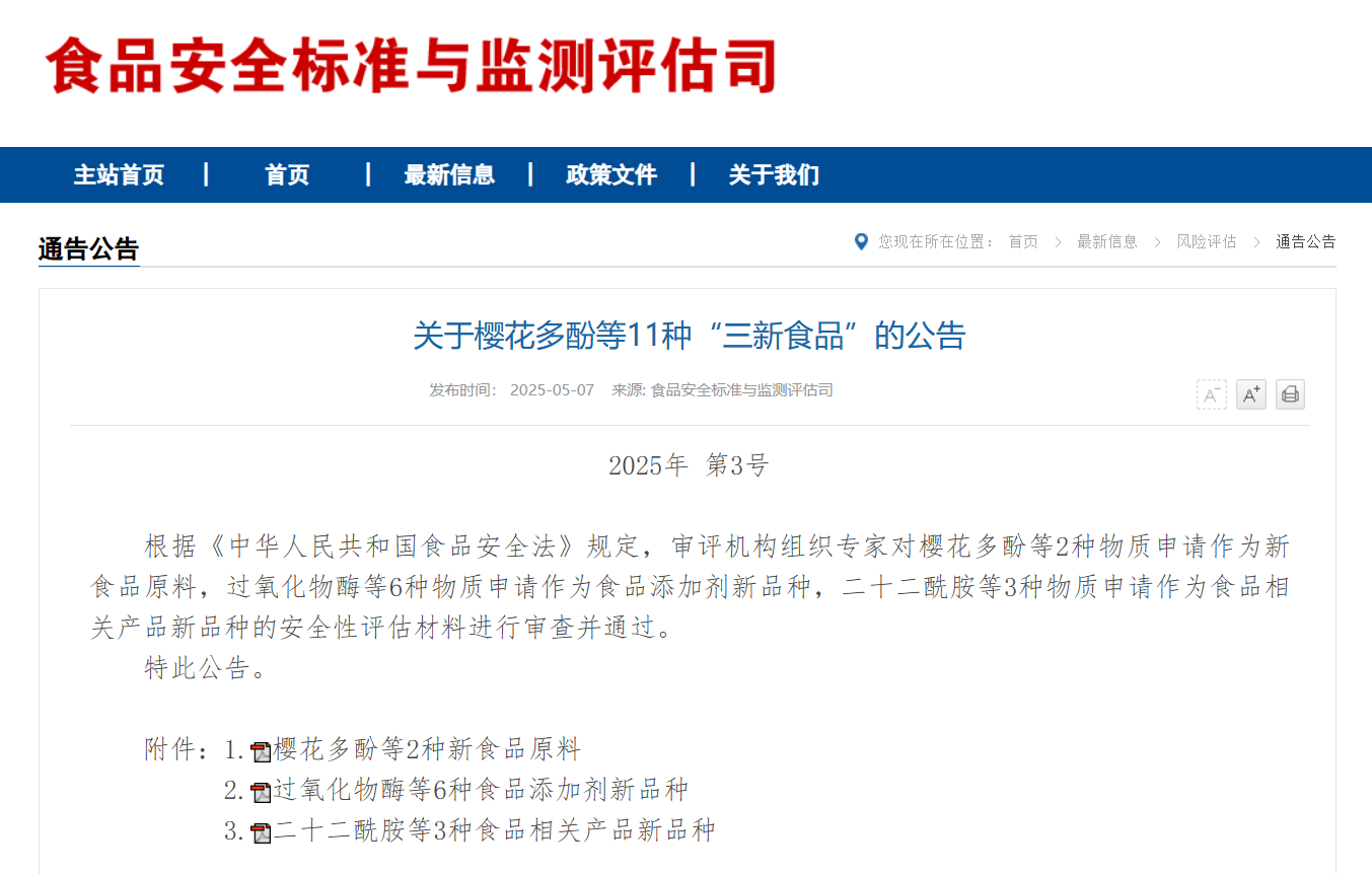 As of May 2025, two official approval notices for “Three New Foods” have been released, covering seven new food ingredients and six new varieties of food additives.