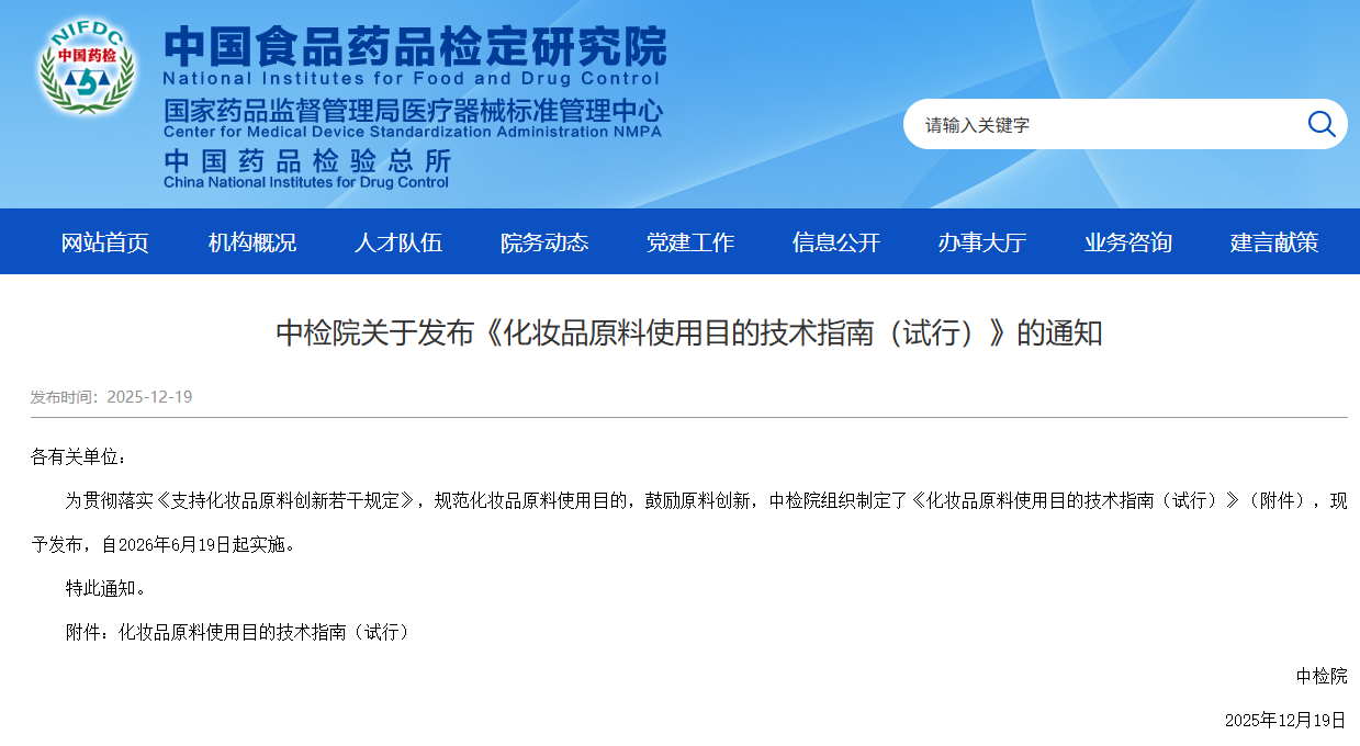 On December 19, 2025, China's National Institutes for Food and Drug Control (NIFDC) released Technical Guidelines for Cosmetic Ingredient Intended Uses(Trial), the Guidelines will come into effect on June 19, 2026.