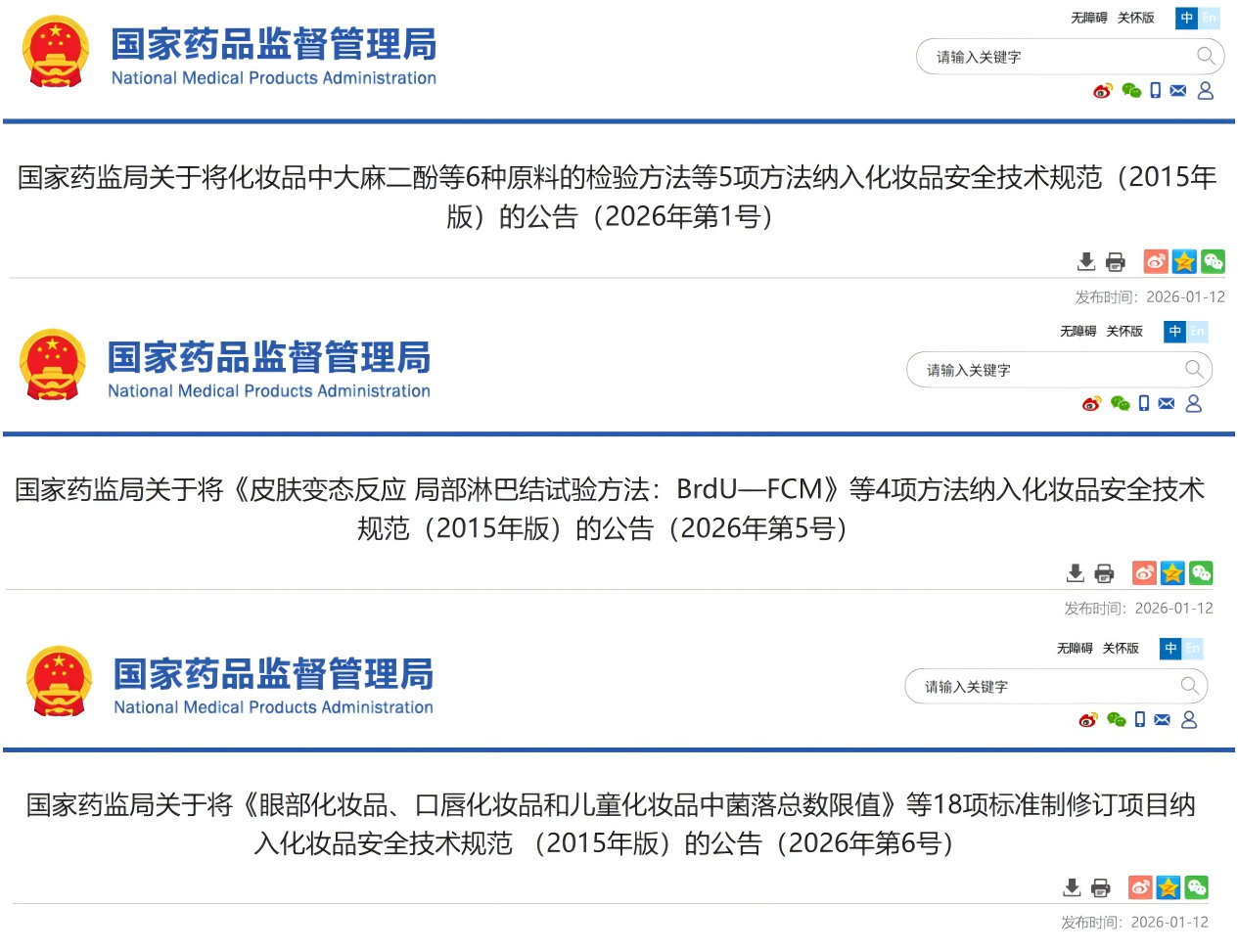 On January 12, 2026, China's National Medical Products Administration (NMPA) issued three announcements (No. 1, No. 5, and No. 6 of 2026), formally incorporating 27 new and updated testing standards, covering the addition and revision of testing methods for 177 cosmetic ingredients, into the Safety Technical Standards for Cosmetics (2015 edition).