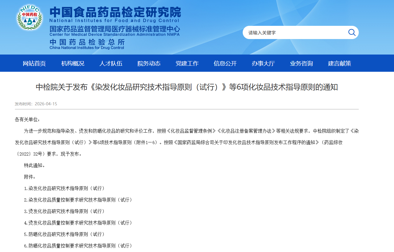 4월 15일 중국식품의약품검정연구원은 《염색화장품 연구기술지도원칙(시행)》《파마 용품 연구기술지도원칙(시행)》《자외선차단화장품 연구기술지도원칙(시행)》 등 6가지 화장품 기술지도원칙을 발표하여 염색, 파마, 자외선차단 화장품의 연구 및 평가 업무를 한층 더 규범화하고 지도하였습니다.