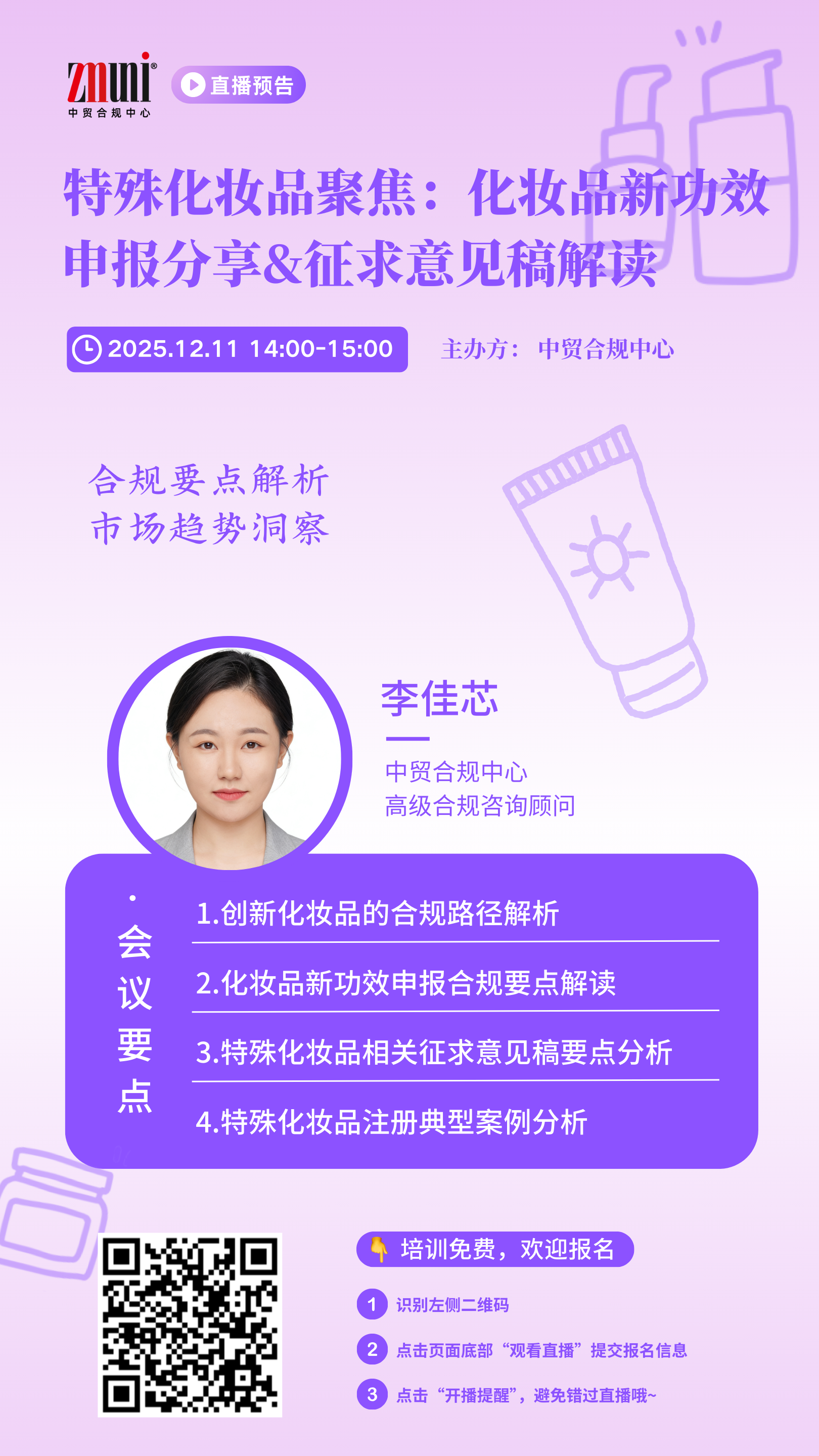 12月11日(周四)下午2点,ZMUni 中贸合规中心将通过本次直播,带您系统梳理化妆品新功效的申报策略及近期征求意见稿关键内容,助力行业同仁高效破解合规痛点、抢占创新先机,诚邀您的参与!