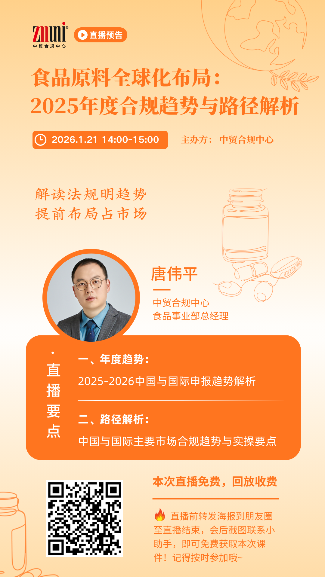 本次“食品原料的全球化布局:合规年度趋势分析与路径解析”演讲,将深度盘点2025-2026年度全球食品原料申报与合规趋势,系统解析中外申报政策差异与准入规则,结合典型实操案例解析全流程关键技巧。演讲旨在为食品原料生产企业、品牌方及研发与法规相关从业者等行业主体精准导航全球化申报方向,助力其高效推进创新原料的合规转化,在全球食品产业高质量发展浪潮中抢占市场先机。