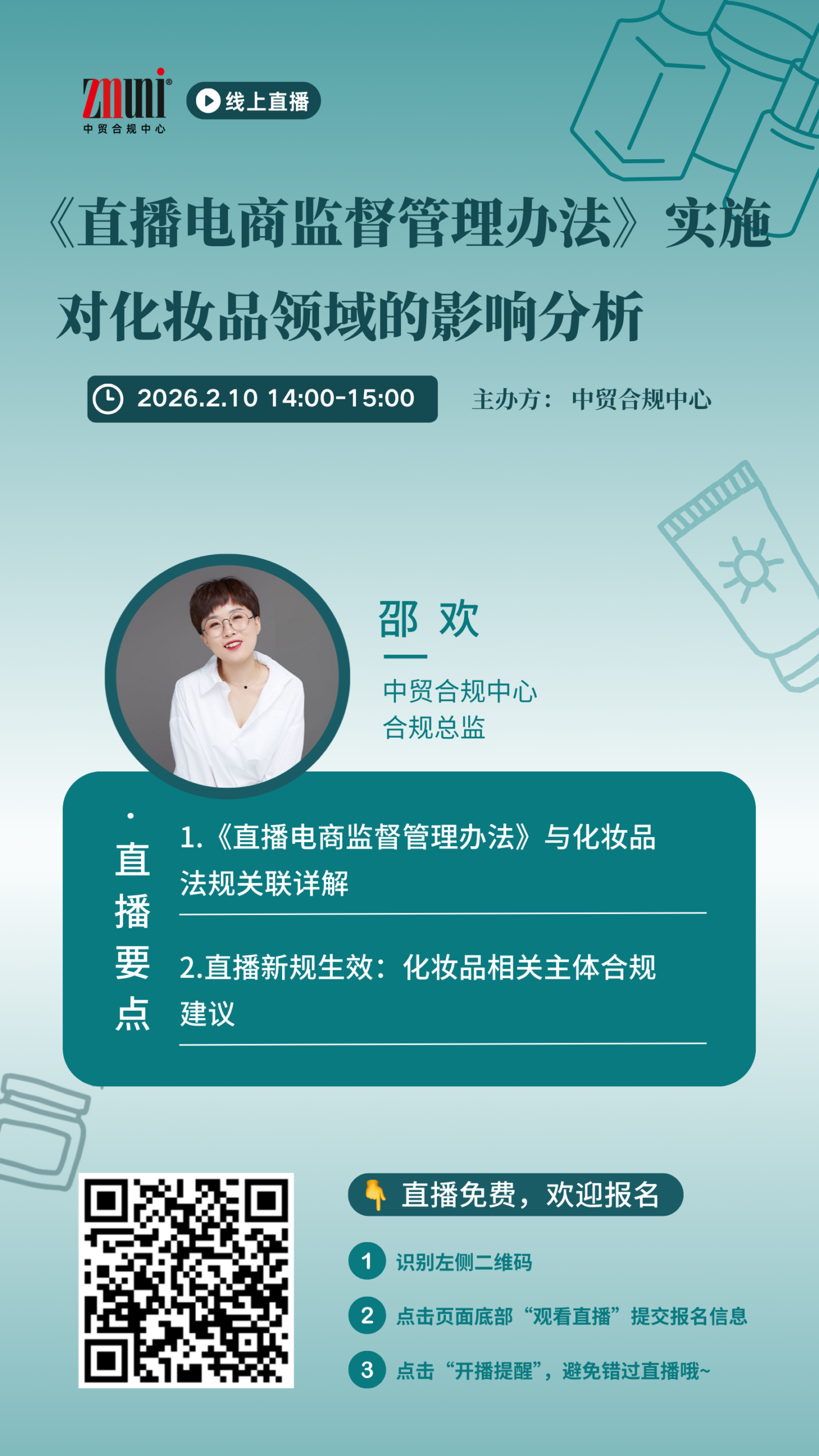 2月10日(周二)下午2点,ZMUni 中贸合规中心将通过本次直播,深入探讨《直播电商监督管理办法》对化妆品相关主体的影响,系统梳理合规要点,诚邀您的参与!