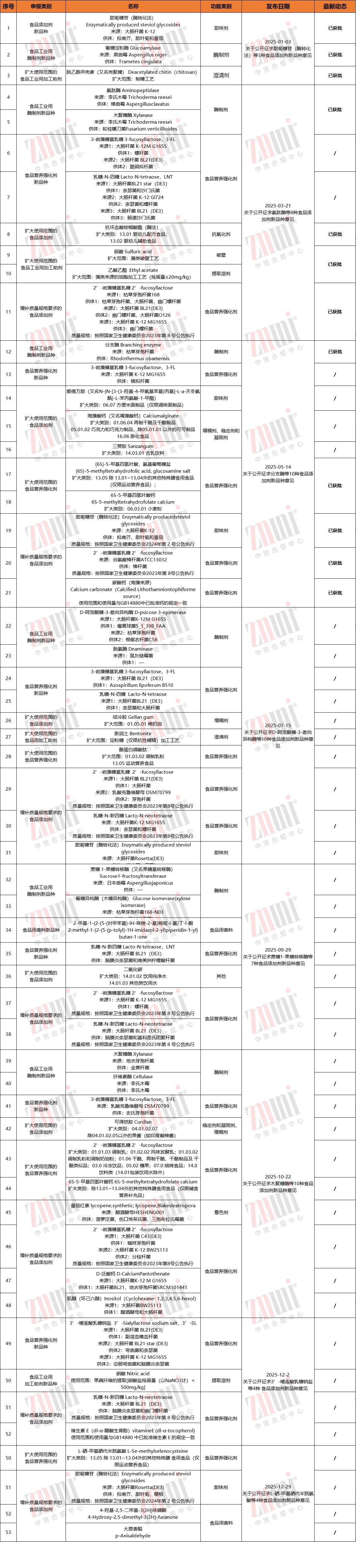 母乳低聚糖、酶制剂、甜味剂在申报与获批中的持续活跃,反映出食品行业向健康化、功能化升级的清晰需求,也为未来创新方向提供了重要参考。