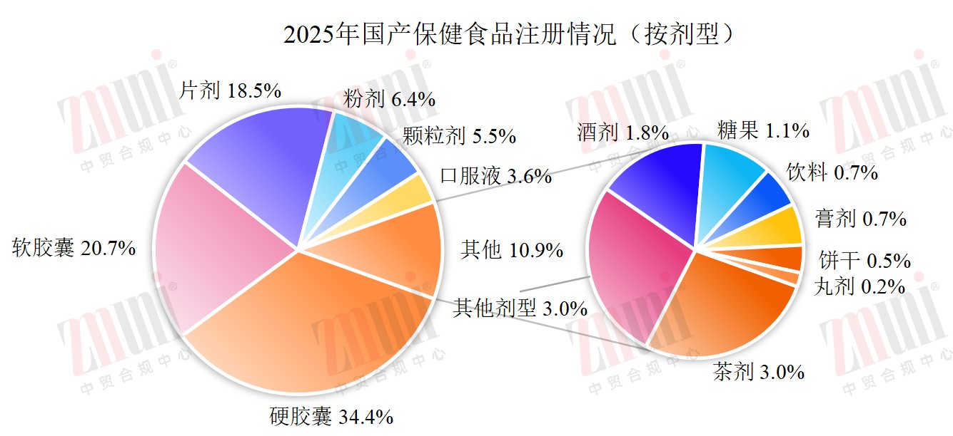 国产保健食品注册剂型分布情况见下图。数据显示,硬胶囊占比最高(34.4%),软胶囊(20.7%)、片剂(18.5%)紧随其后,三者合计超整体产品总数7成,其余剂型占比较低,整体呈现“胶囊+片剂”为主导的集中化剂型分布特征。