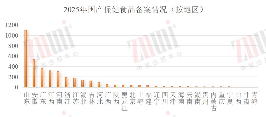 国产保健食品备案地区分布如下图,共有29个省、自治区、直辖市的企业获得备案凭证。其中,山东省备案数量最多,其次是安徽省、广东省、江西省与河南省,数据反映国产备案分布区域集聚性较强。