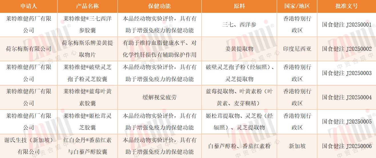2025年,共有6款进口保健食品获得注册批件,打破2018年-2024年间“零获批”的局面,具体情况见下表。其中6款产品来自三家企业,其中4款来自中国香港的莱特维健药厂有限公司,其余两款分别来自新加坡的谢氏生技(新加坡)有限公司和印度尼西亚的荷尔梅斯有限公司。6款产品剂型主要以胶囊为主,保健功能涉及“有助于增强免疫力”、“维持血脂健康水平”、“对化学性肝损伤有辅助保护作用”、“缓解视觉疲劳”四种,其中涉及一款双功能产品,保健功能为“有助于维持血脂健康水平、对化学性肝损伤有辅助保护作用”。