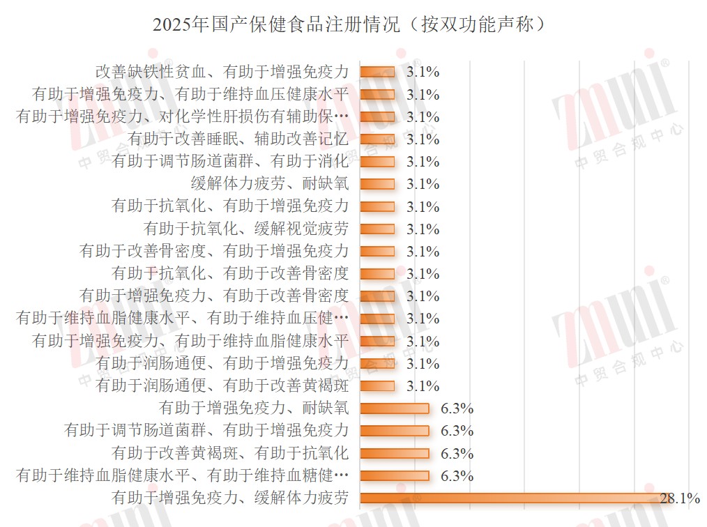 申报双功能的产品中,超8成组合绑定“有助于增强免疫力”,其中“有助于增强免疫力+缓解体力疲劳”以28.1%居首,是双功能产品中的热门组合。