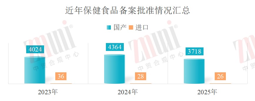 根据特殊食品信息查询平台信息查询,2025年保健食品国产备案批准3718款、进口备案批准26款,较前两年备案数量均有所降低,具体情况见下图: