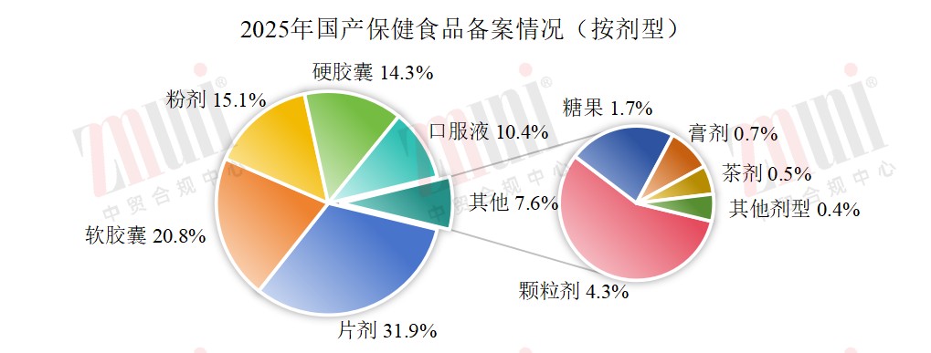 国产保健食品备案剂型分布主要为主流剂型(如片剂、软胶囊、粉剂和硬胶囊)高度集中,小众剂型占比较低(如糖果、膏剂、茶剂等),具体分布情况见下图: