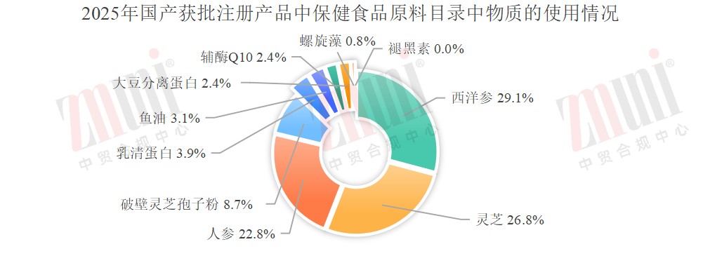 保健食品原料目录中10个功能性原料在国产注册获批产品中的分布如下图。其中西洋参使用情况最高(29.1%),灵芝、人参与破壁灵芝孢子粉紧随其后,也是主流选择之一;其他原料使用占比相对偏低,其中褪黑素在2025年的注册中暂未被使用。