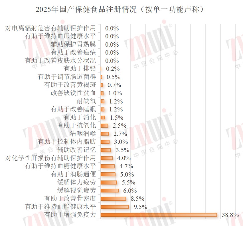 申报单一功能的产品中,“有助于增强免疫力”为绝对主力,占比为38.8%,继续维持往年高热度趋势。“有助于维持血脂健康水平”与“有助于改善骨密度”受银发经济驱动,稳居第二与第三,分别占9.5%和8.5%。