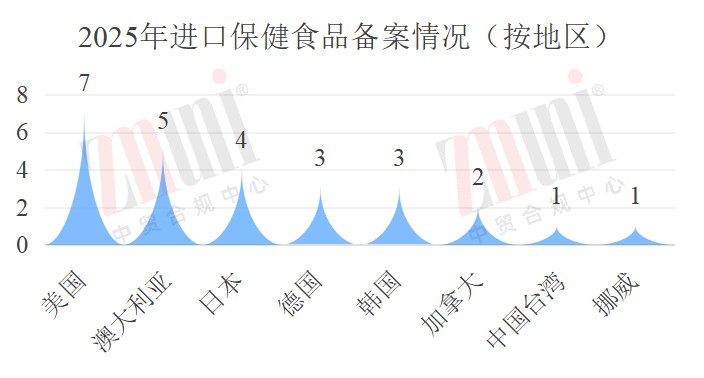 进口保健食品备案地区分布如下图,涉及美国、澳大利亚、日本等8个地区。其中美国以7款备案数量居首,澳大利亚(5款)与日本(4款)紧随其后,三者共计16款,占进口总备案量超6成。