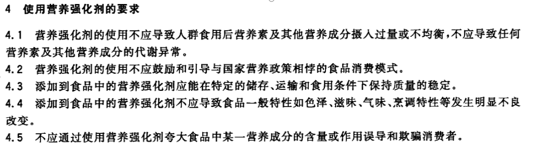 在我国,针对营养强化剂的使用规定,有对应的国家标准,即GB 14880 《食品安全国家标准 食品营养强化剂使用标准》,标准明确规定了使用营养强化剂的要求(如下图)以及使用规定,标准规定营养强化剂在食品中使用时,其使用范围、使用量需符合GB 14880附录A的要求,且允许使用的化合物来源应符合GB 14880附录B的规定。另外,GB 14880附录C规定了允许用于特殊膳食用食品的营养强化剂及化合物来源,以及仅允许用于部分特殊膳食用食品的其他营养成分及使用量。