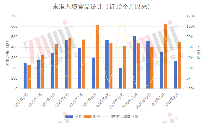 2月,全国海关在口岸监督环节检出安全卫生等项目不合格并未准入境的食品共计452批次,环比下降约28%(较2026年1月629批次减少177批次),同比上升约69%(较去年同期267批次增加185批次)。