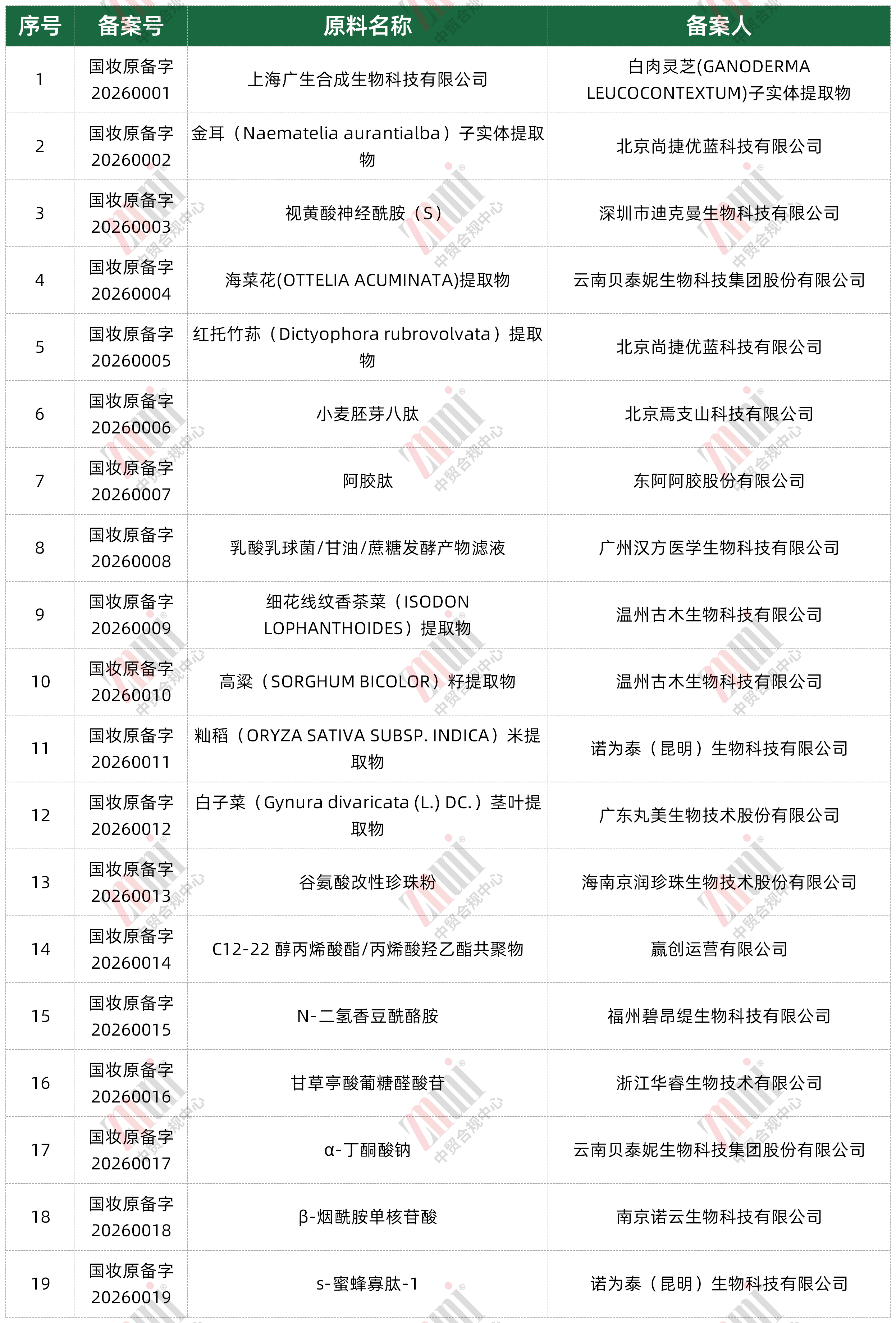 2026年1月,国家药监局共公示19个化妆品新原料备案信息,相关信息如下: