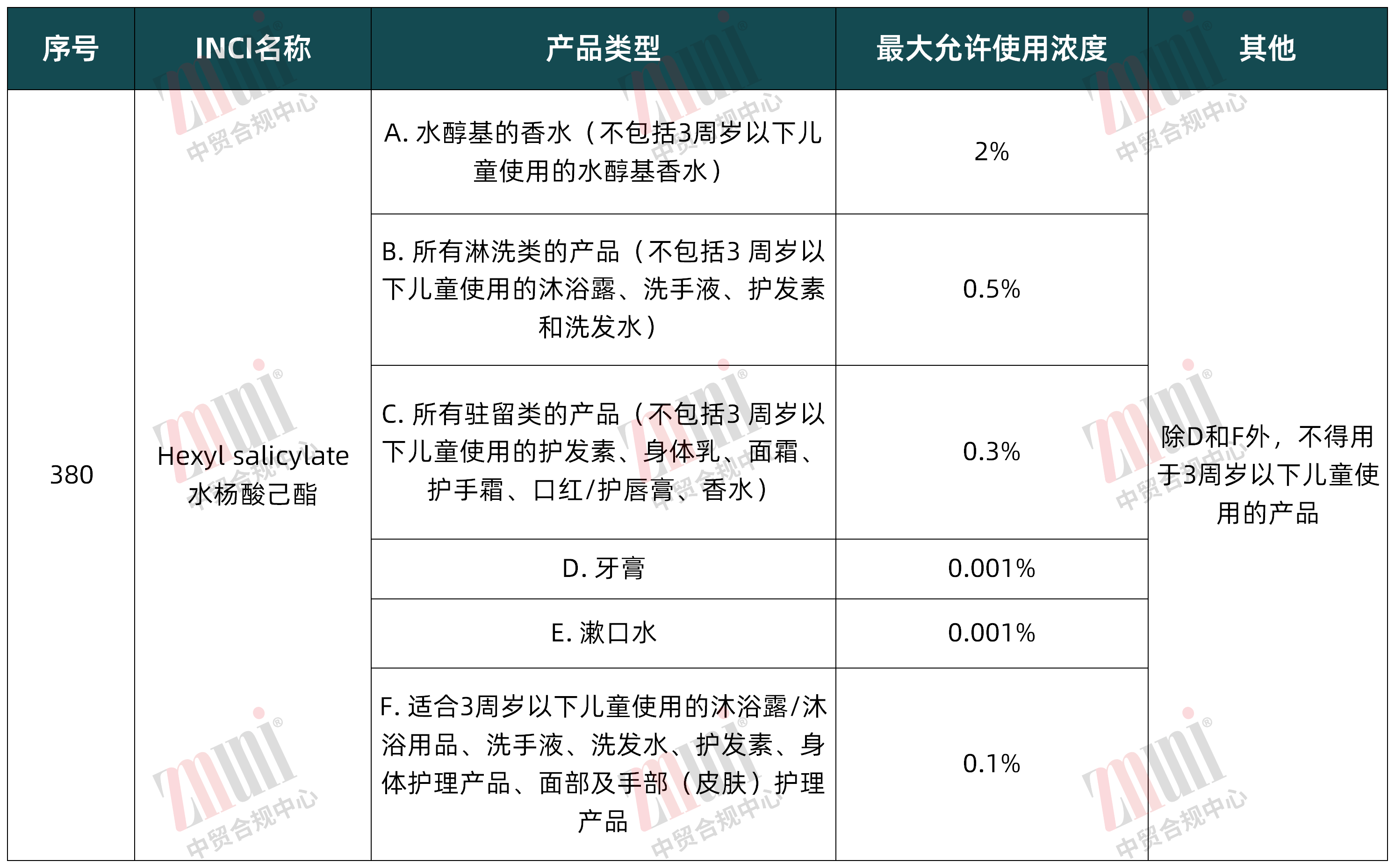 2024年水杨酸己酯因具有生殖毒性而其被欧盟列为CMR 2类物质,欧盟消费者安全科学委员会(SCCS)于2024年10月 25 日发布的 SCCS/1668/24 号意见中,评估水杨酸己酯在3岁及以下儿童使用的产品中,添加规定浓度时是安全的,参考该意见,欧盟在化妆品法规附件III中新增相关内容,具体如下: