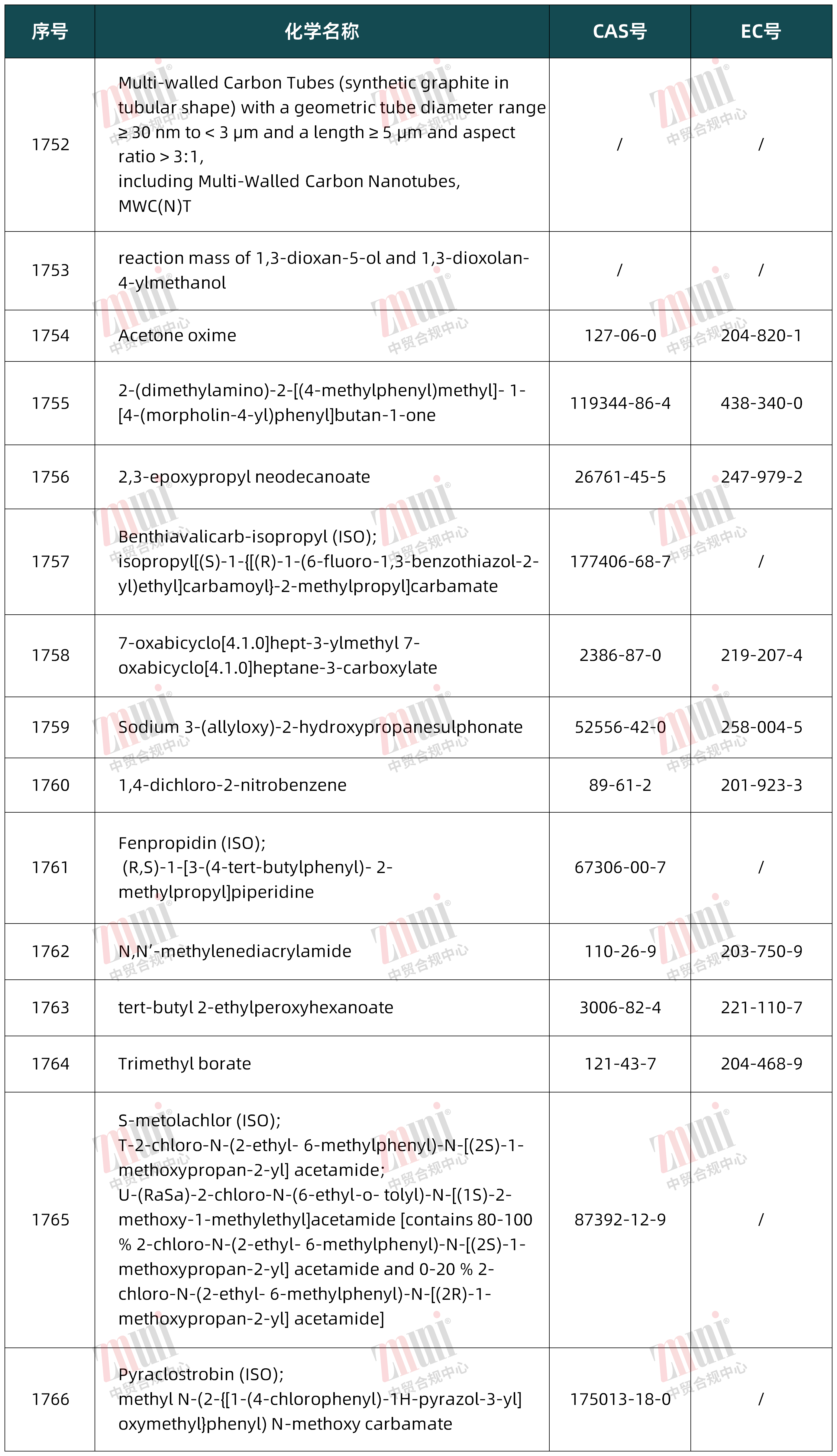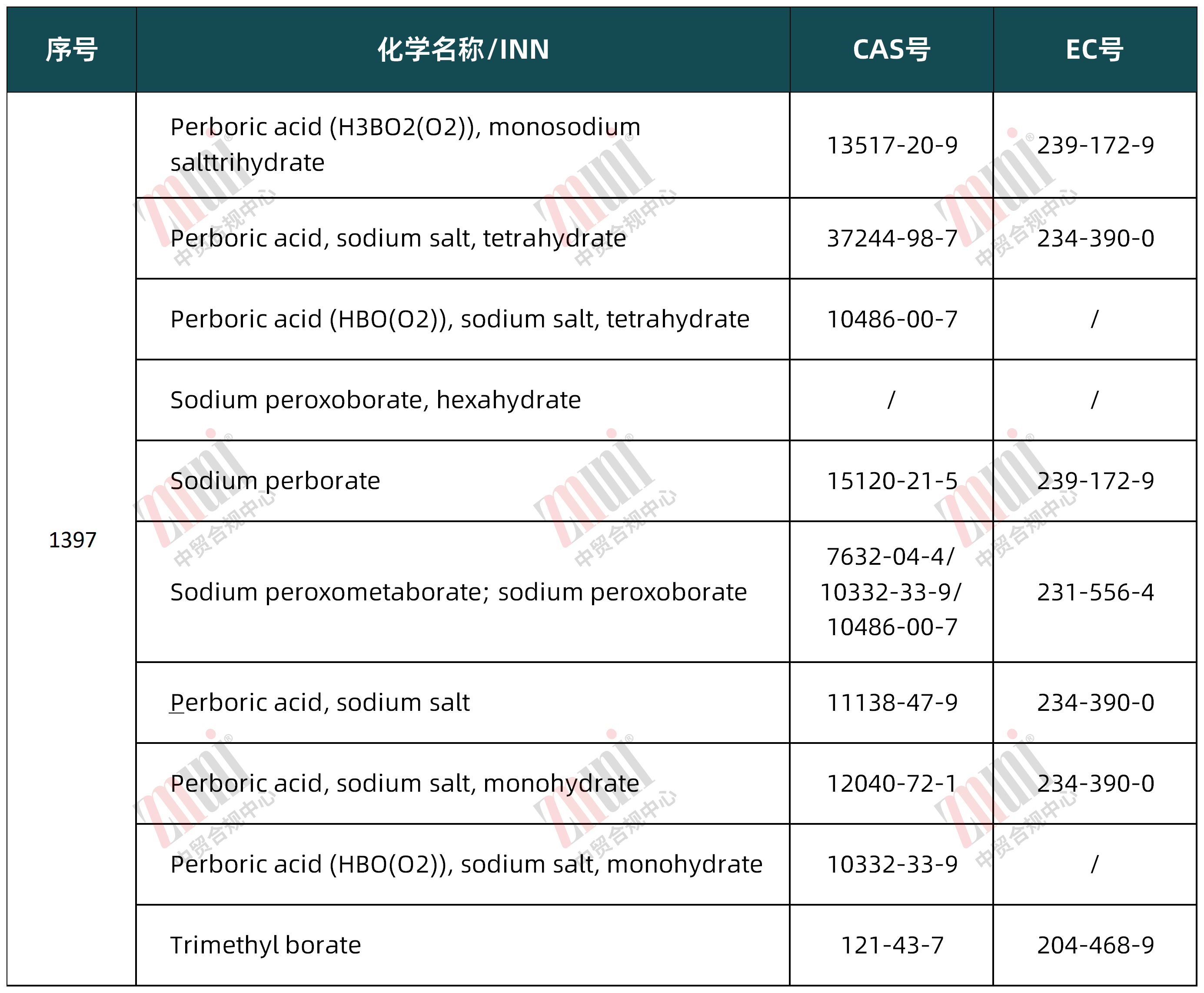 原附件 II中第 1397、1398、1399 分别列出了过硼酸盐的不同衍生物,这些物质均为CMR 1B类物质。由于这几种物质结构相关、化学性质等相似,为便于监管,合并此3项做为修订后的第1397项,删除原1398、1399。