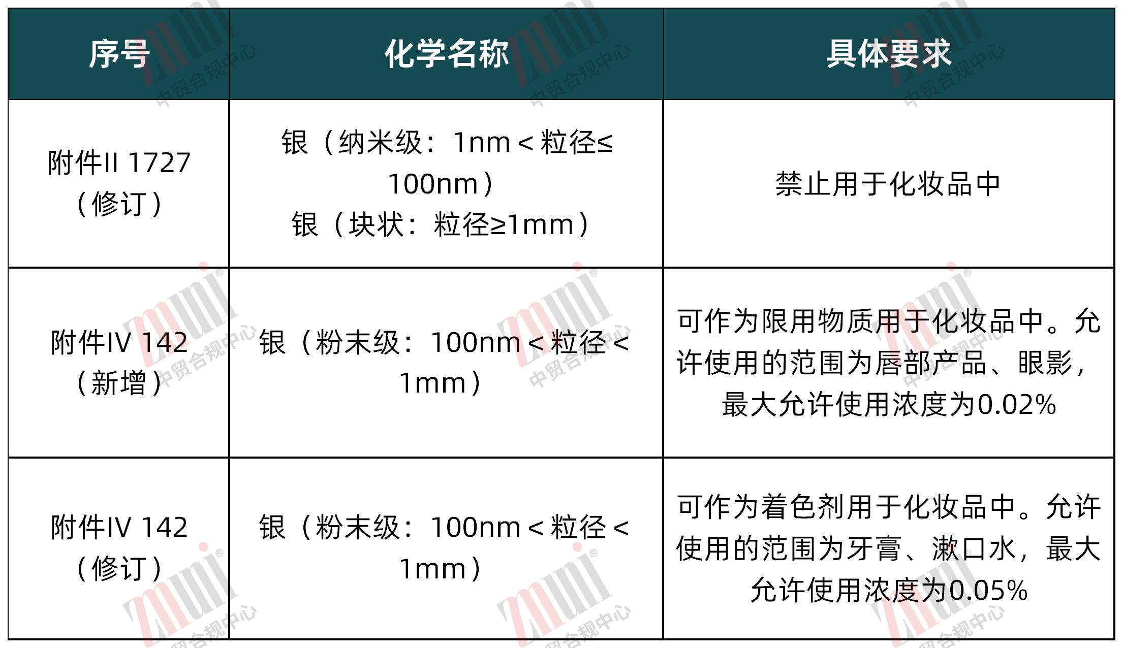 银在2024年因其生殖毒性被欧盟列为CMR 2类物质。欧盟化妆品法规中原规定1nm<粒径≤100nm的银禁止在化妆品中使用;块状银和粉末银(粒径分别为≥1mm和100nm<粒径<1mm)作为着色剂(CI 77820)允许在化妆品中使用。经本次修订后,有关银的使用要求调整如下: