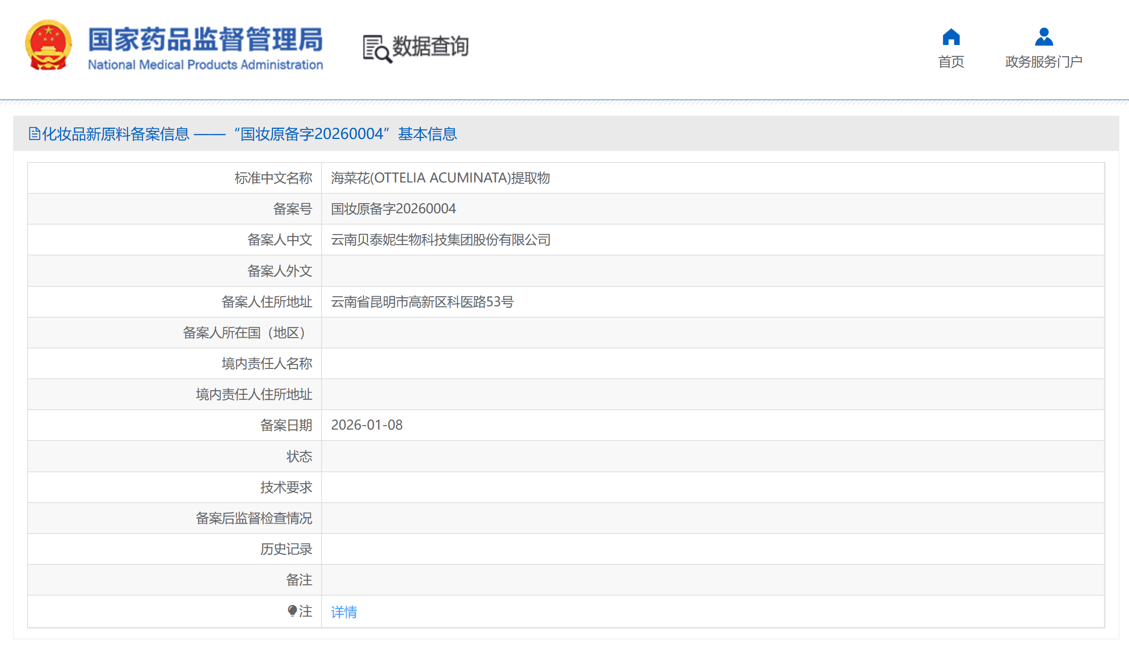 海菜花(OTTELIA ACUMINATA)提取物(备案号:国妆原备字20260004),由云南贝泰妮生物科技集团股份有限公司备案。目前相关技术要求尚未披露,且尚未进入监测期。