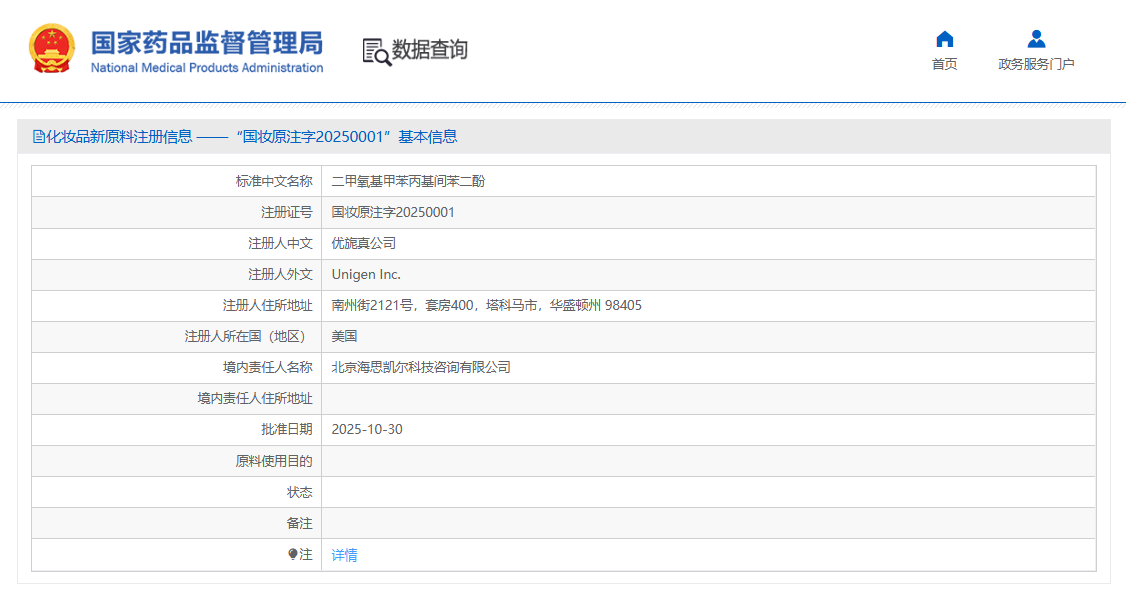 二甲氧基甲苯丙基间苯二酚(注册证号:国妆原注字20250001),由优旎真公司注册。