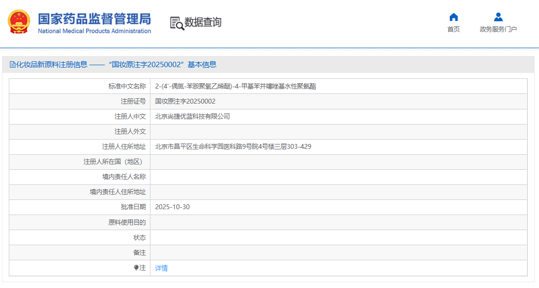 据公开信息显示,北京尚捷优蓝科技有限公司自主研发的“2-(4’-偶氮-苯胺聚氧乙烯醚)-4-甲基苯并噻唑基水性聚氨酯”(商品名:安色®洛神朱)正式通过国家药品监督管理局(NMPA)审批,成为全球首个获批用于化妆品领域的高分子着色剂。这也是第一个成功获批的注册类国产化妆品新原料,标志着我国在化妆品着色技术领域实现从“跟跑”到“领跑”的历史性跨越。
