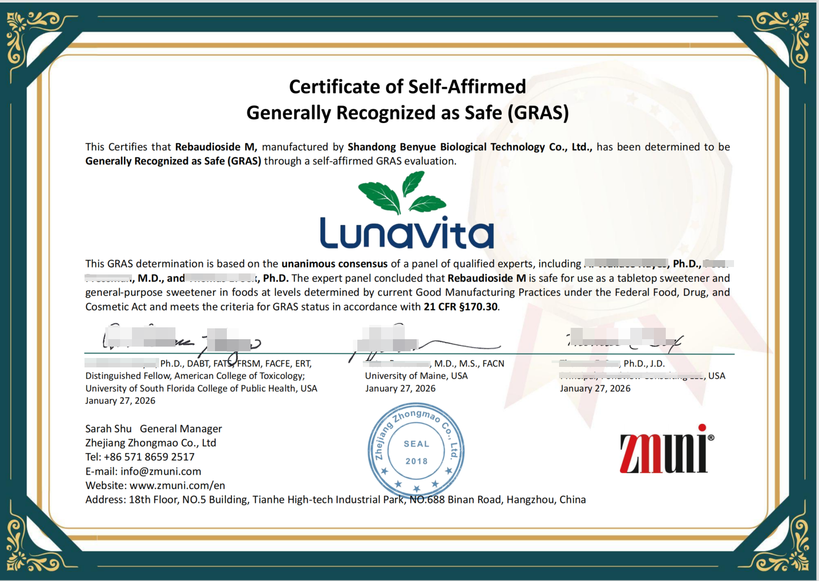 此次美国Self GRAS认证由国际公认的独立专家小组评审通过,为 Reb M敲开欧美主流市场大门,凭借国际权威认可破除市场准入壁垒,大幅提升产品在欧美高端市场的认可度与核心竞争力,为【山东奔月生物科技股份有限公司】深耕欧美市场、拓展全球Reb M消费版图筑牢核心基础。
