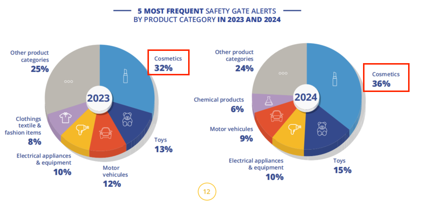 与2023年情况类似,“化妆品” 类别在通报数量上位居榜首(36%),其次是玩具(15%)、电器(10%)、机动车(9%)和化学产品(6%)。