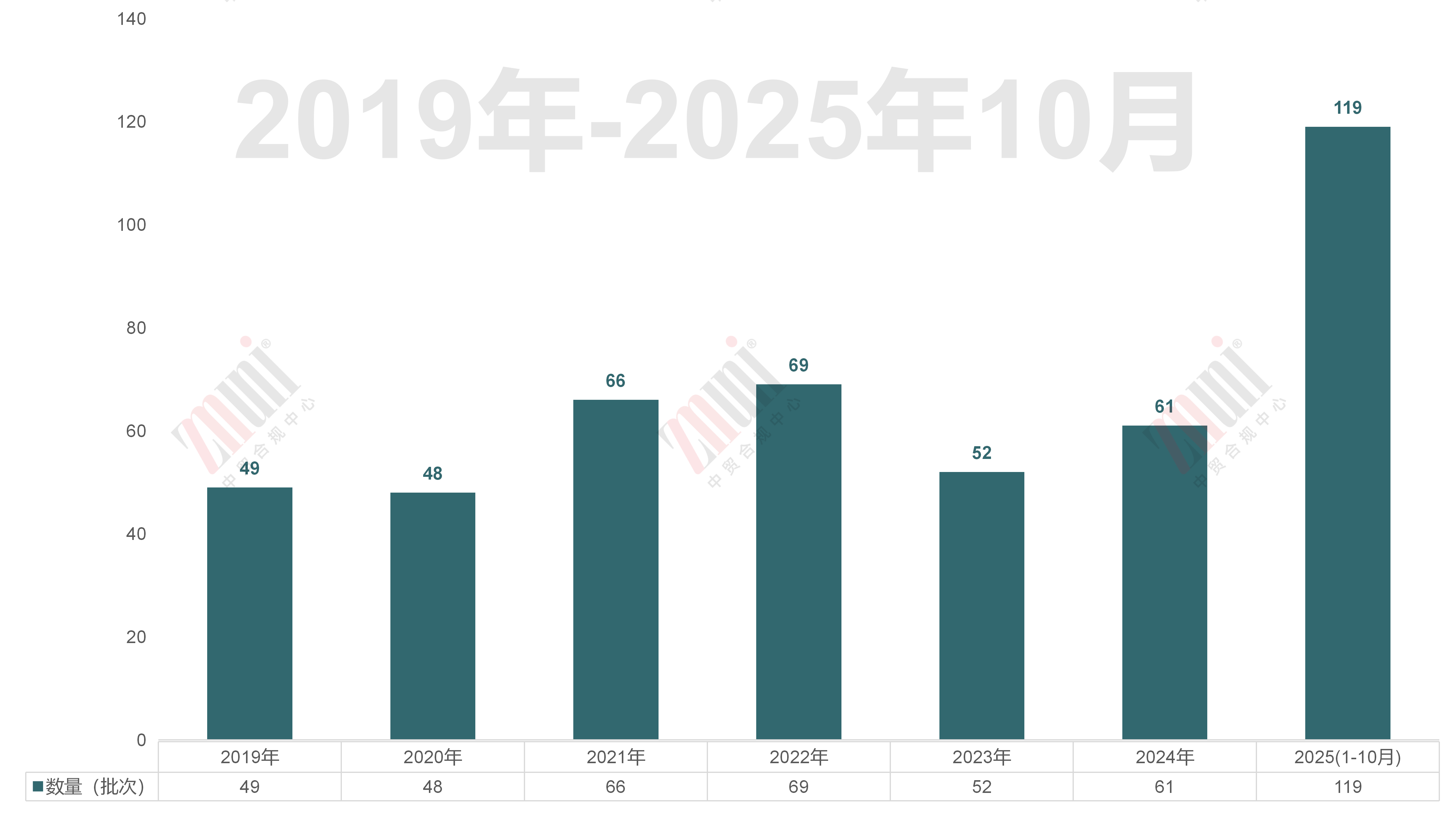 2025年度,截止至10月31日,美国食品药品监督管理局(Food and Drug Administration, FDA)共通报拒绝来自中国的119批次化妆品入境,涉及清洁、护肤、彩妆、美甲等相关产品。该数据相较2024年同期的 47 批次大幅上升,同比增长高达 153.2%。