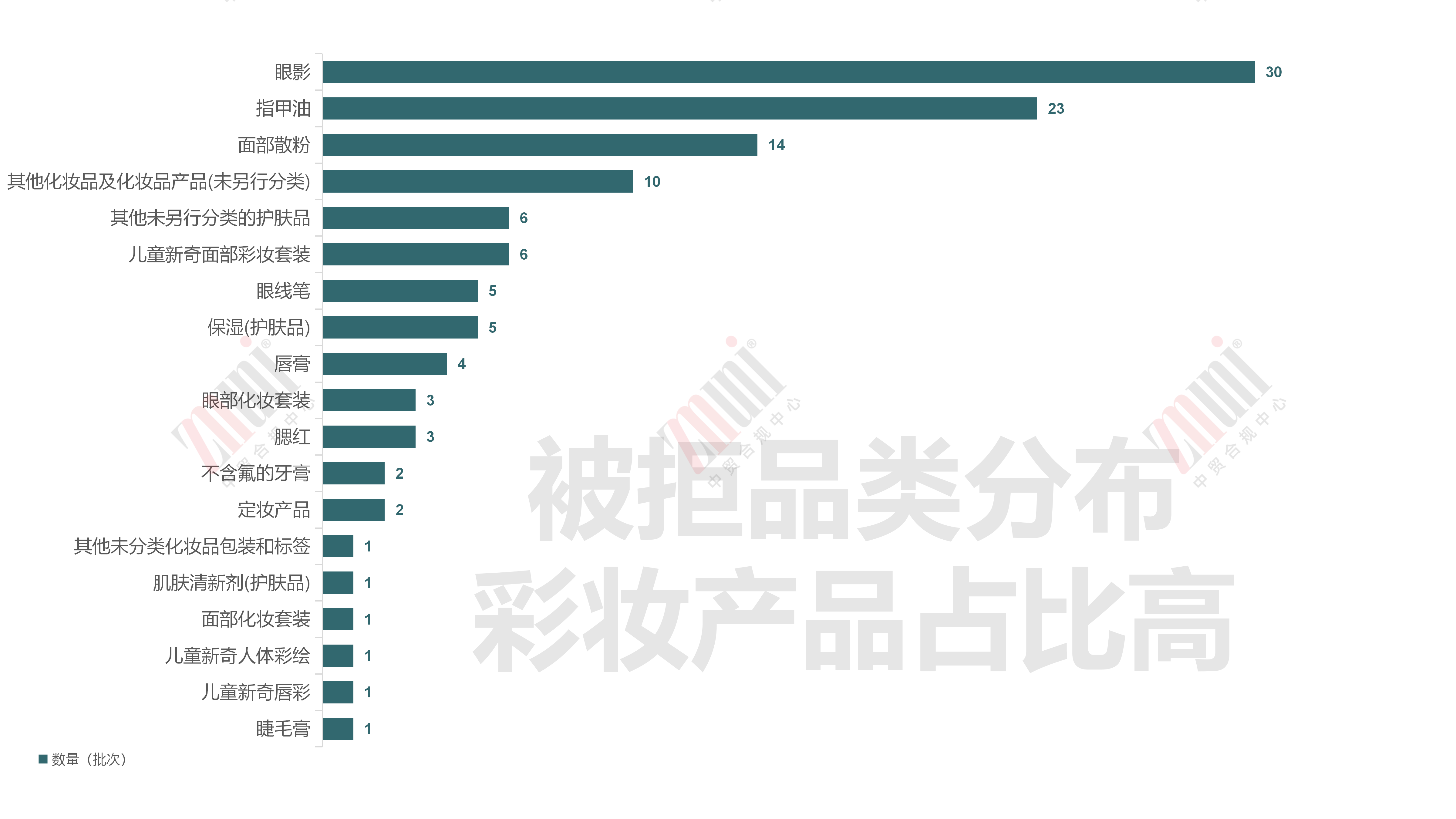 从被拒品类分布来看,彩妆产品占据主要比例。其中,眼影产品被拒数量最高,共30批次,占比25.21%;指甲油以23 批次位居第二,占比19.32%。