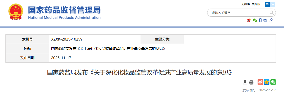 2025年11月17日,国家药监局发布《关于深化化妆品监管改革促进产业高质量发展的意见》(以下简称《意见》)。
