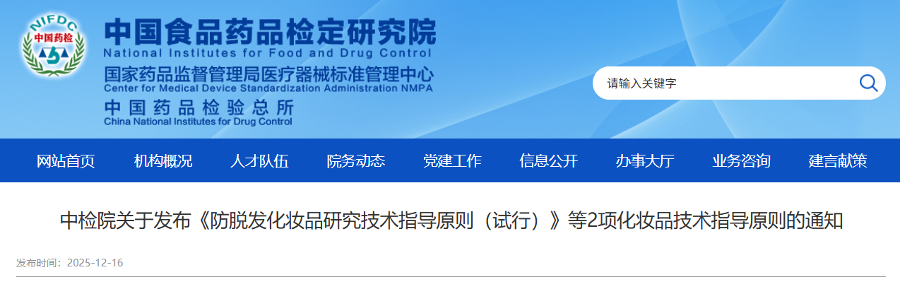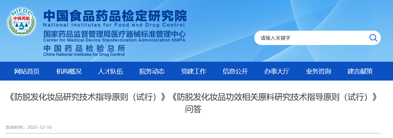 2025年12月16日,中检院发布《防脱发化妆品研究技术指导原则(试行)》等2项化妆品技术指导原则及相关问答,具体内容如下: