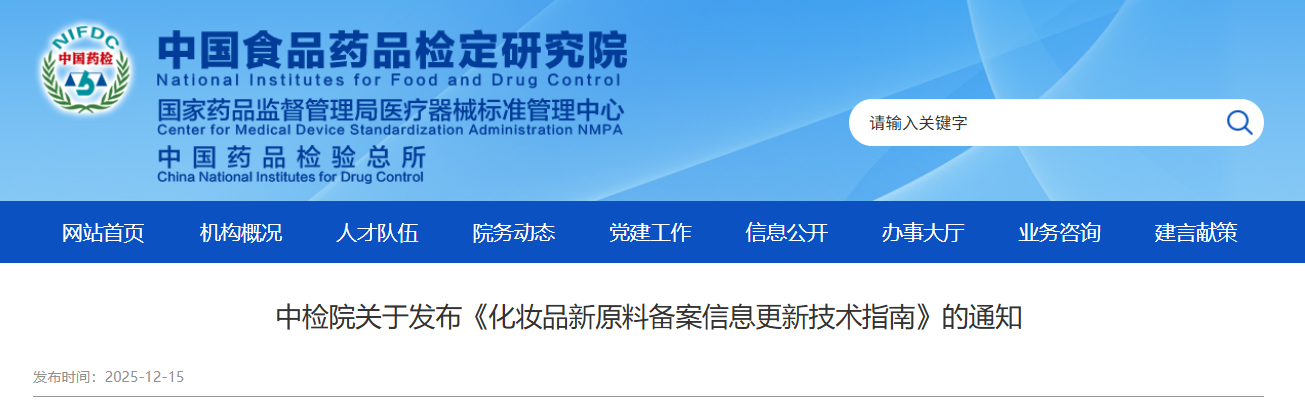 为落实国家药监局《支持化妆品原料创新若干规定》,明确已上市新原料变更路径,指导新原料注册人、备案人规范开展相关工作,按照《化妆品监督管理条例》《化妆品注册备案管理办法》等相关法规要求,中检院组织制定了《化妆品新原料备案信息更新技术指南》(见附件)。按照《国家药监局综合司关于印发化妆品技术指导原则发布工作程序的通知》(药监综妆〔2022〕32号)要求,现予发布。