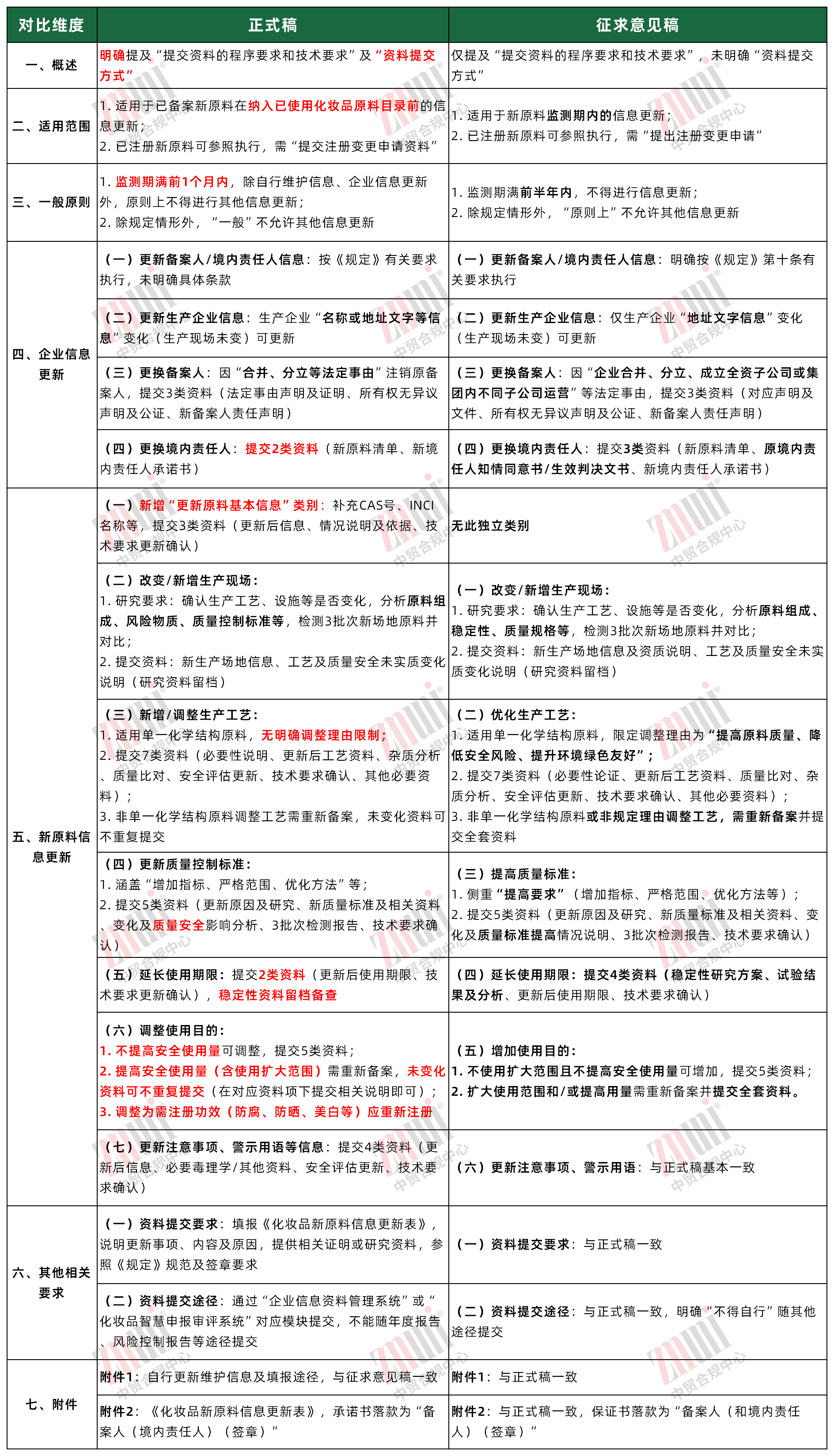 ZMUni中贸合规中心对正式发布的《化妆品新原料备案信息更新技术指南》与此前发布的《化妆品新原料备案信息更新技术指南》(征求意见稿)版本进行了对比分析,见下图:
