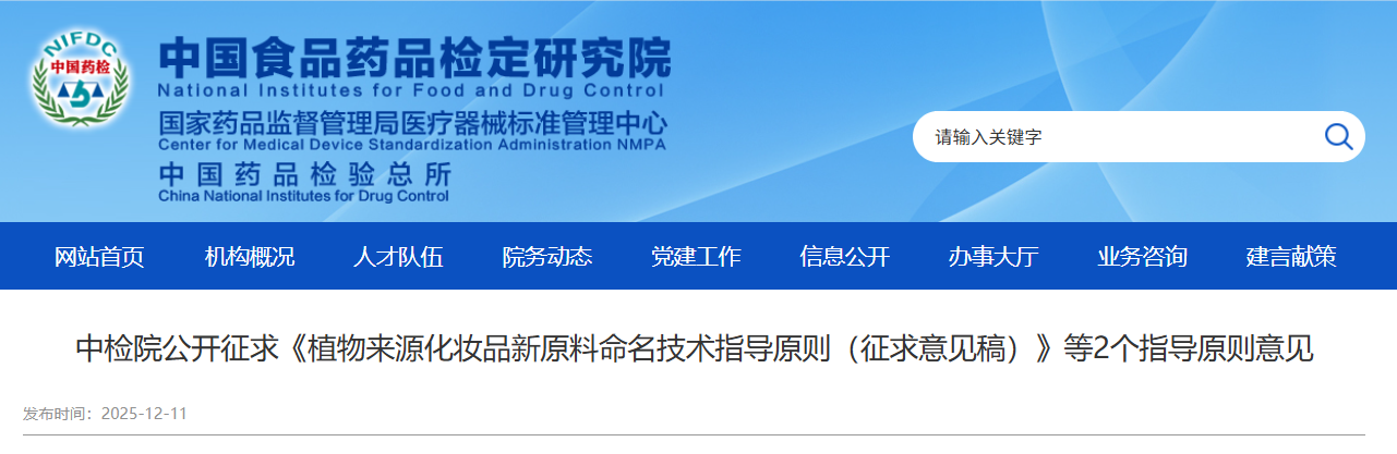 为落实《国家药监局关于深化化妆品监管改革促进产业高质量发展的意见》和《支持化妆品原料创新若干规定》,进一步规范和指导化妆品新原料命名工作,按照《化妆品监督管理条例》《化妆品注册备案管理办法》等相关法规文件要求,中检院起草了《植物来源化妆品新原料命名技术指导原则(征求意见稿)》《发酵来源化妆品新原料命名技术指导原则(征求意见稿)》及起草说明(附件1—4),现向社会公开征求意见。