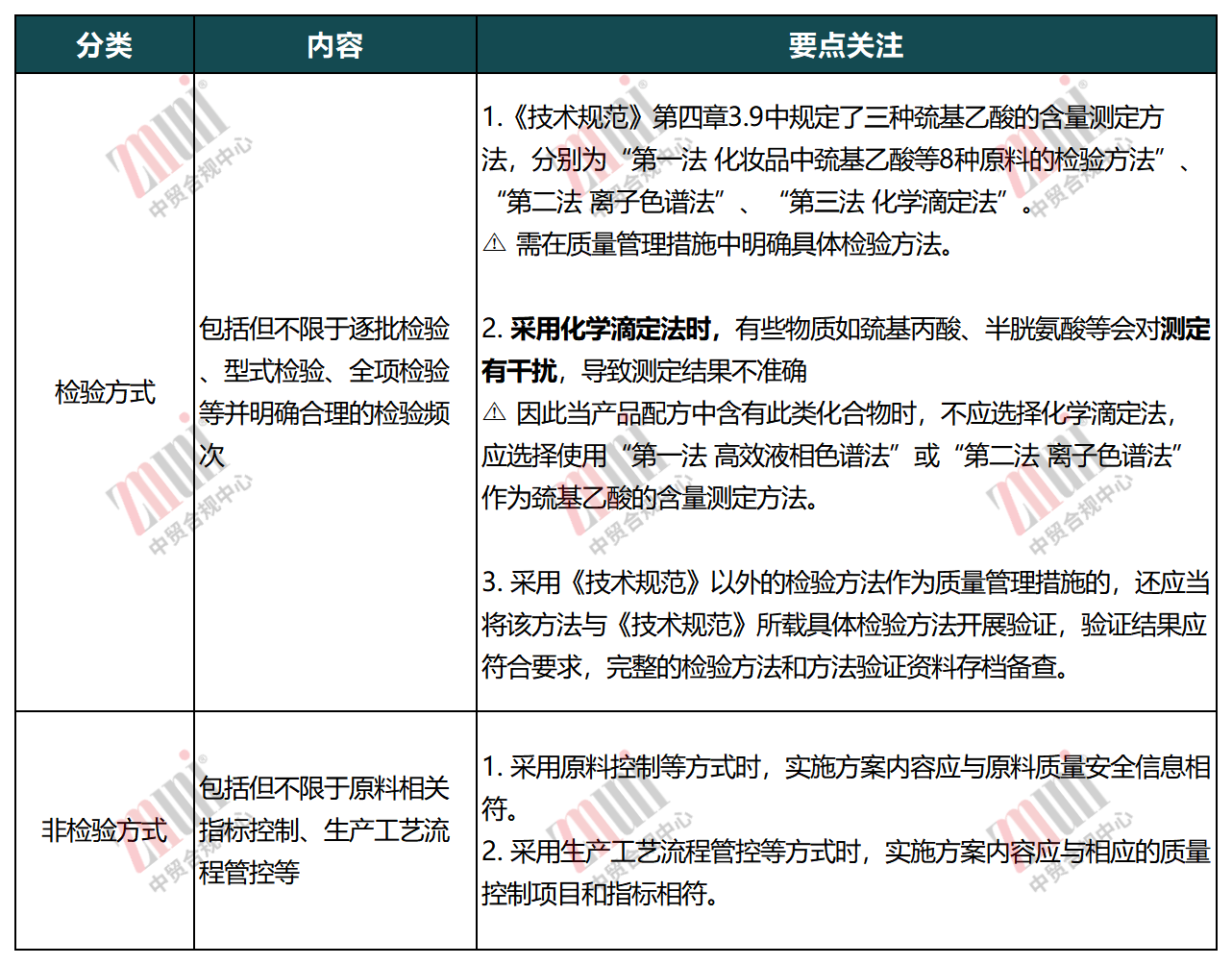 重要关注③:功效成分(巯基乙酸)质量管理措施应注意选择适宜的检验方法;且质量控制措施的方式选择需要重点关注,不应仅采取“原料相关指标控制”的方式。
