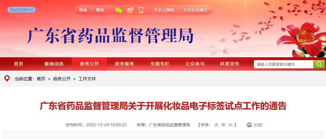 为进一步优化化妆品(含牙膏,下同)标签管理工作,满足消费者知情权和适老化需求,服务企业生产经营便利化,助力化妆品产业高质量发展,根据《国家药监局关于开展化妆品电子标签试点工作的通知》(国药监妆〔2025〕16号)(以下简称《通知》)要求,广东省药品监督管理局决定自2026年2月1日起试点通过电子标签方式标注化妆品中文标签,为期3年。现将有关事项通告如下: