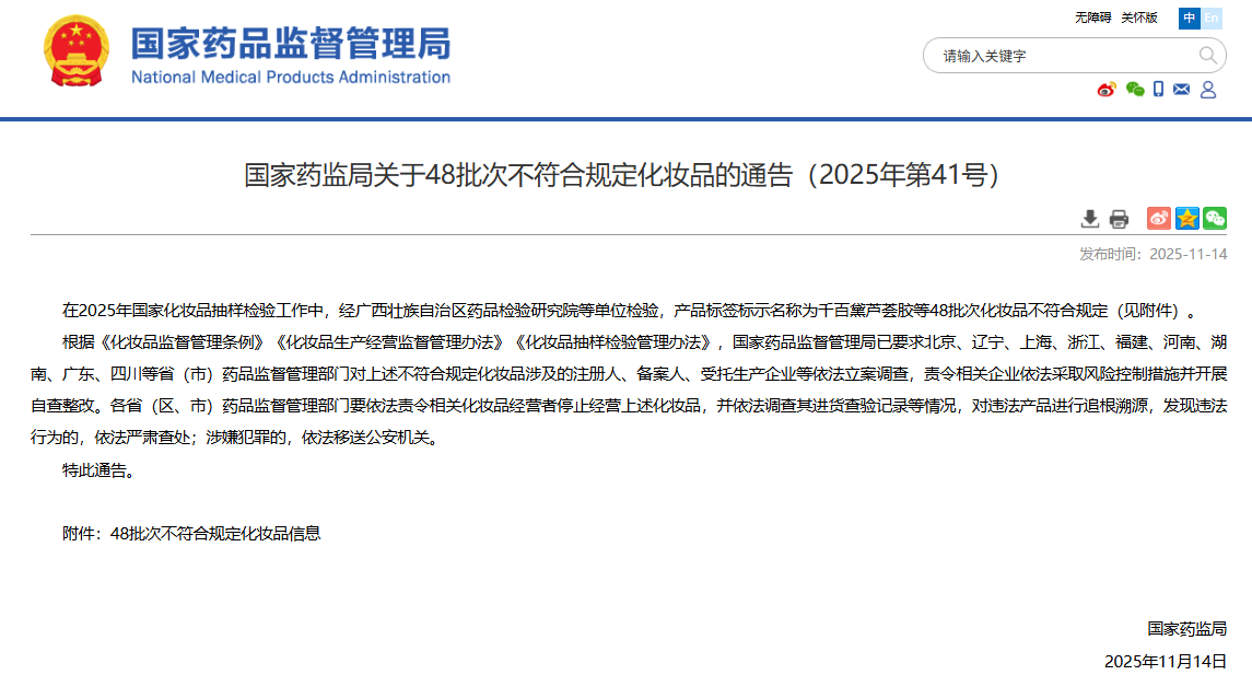2025年11月14日,国家药品监督管理局官方网站发布《关于48批次不符合规定化妆品的通告》。这是继今年4月底以来,时隔6个月后国家药监部门再次公布化妆品抽检不合格情况。
