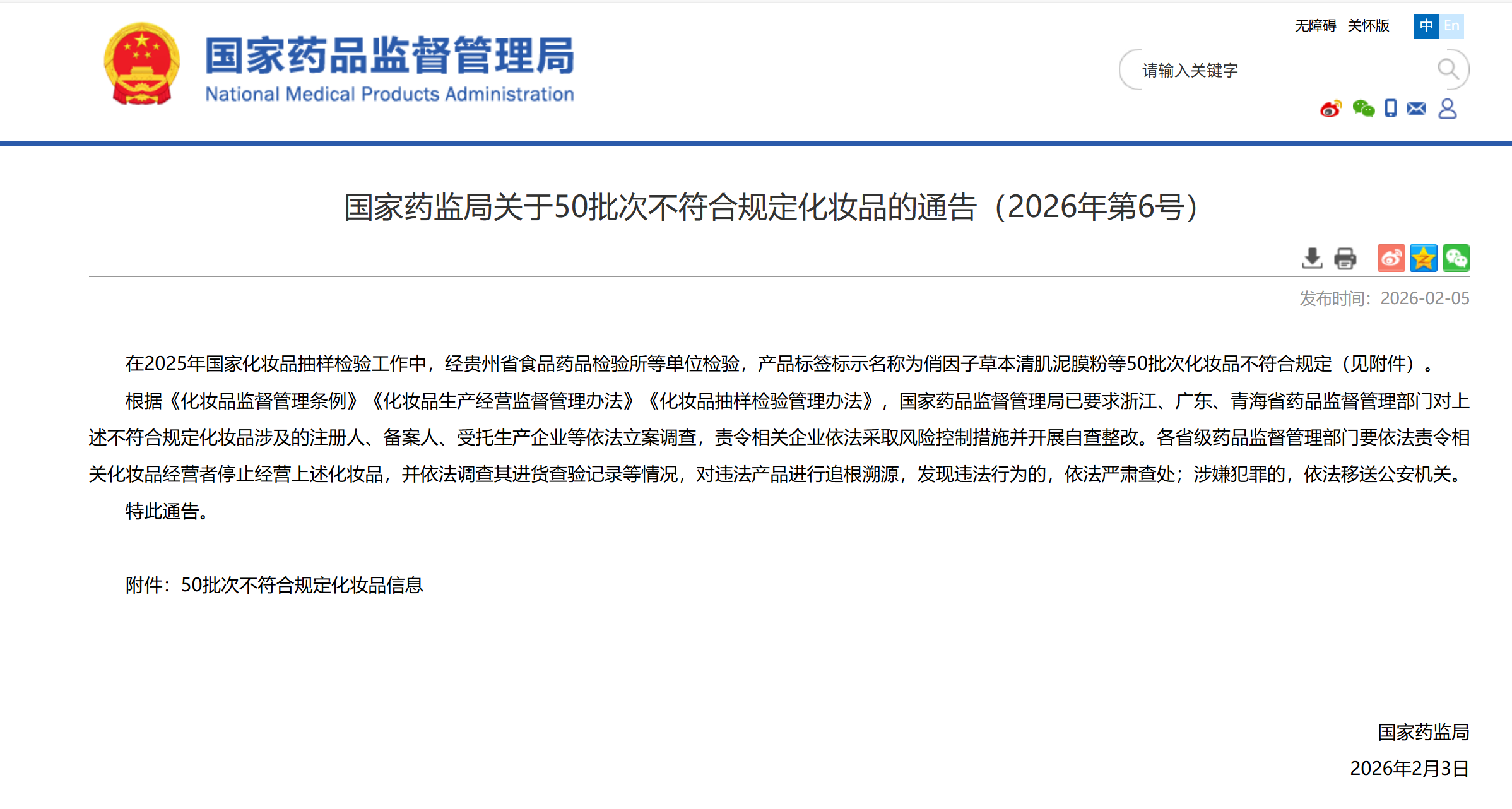 2026年2月5日,国家药品监督管理局发布50批次不符合规定化妆品的通告。通告显示,在2025年国家化妆品抽样检验工作中,经贵州省食品药品检验所等单位检验,产品标签标示名称为俏因子草本清肌泥膜粉等50批次化妆品不符合规定。