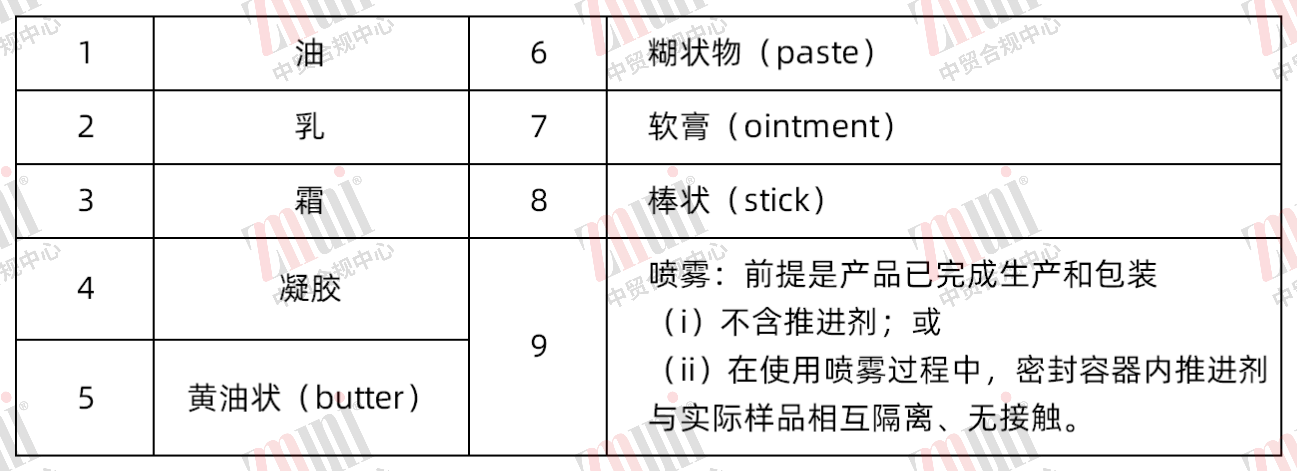 (a)如果防晒产品含有OTC专论M016中§M016.20 (e)列明的皮肤保护剂活性成分(例如尿囊素、聚二甲基硅氧烷、羊毛脂等),则需符合下表所列剂型;