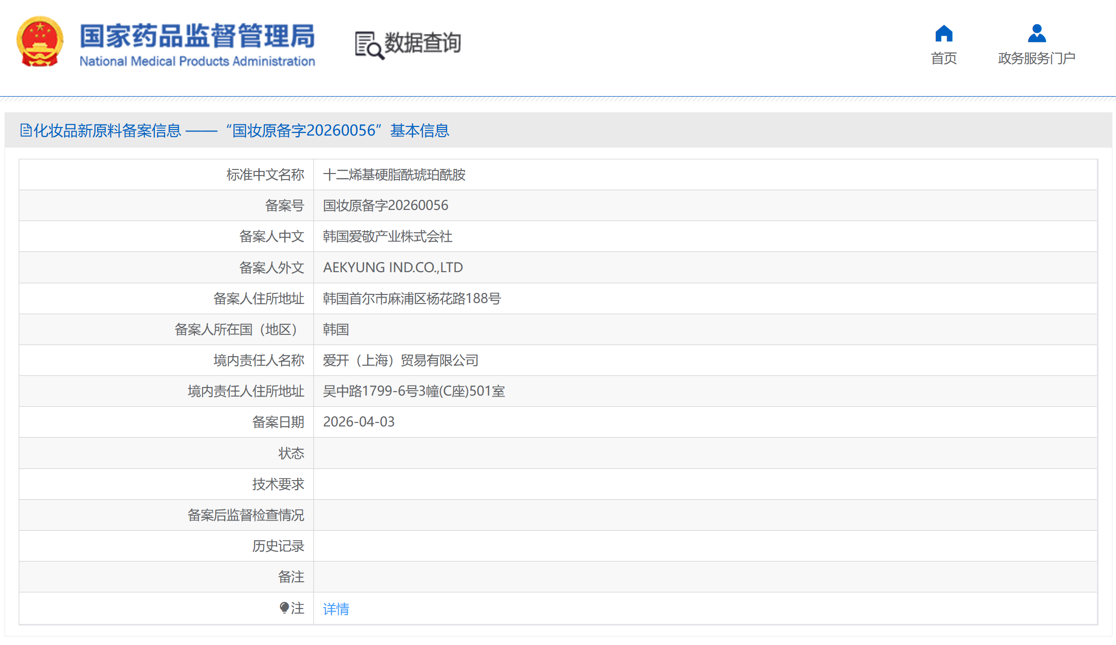 2026年4月3日,据国家药监局公示平台显示,十二烯基硬脂酰琥珀酰胺完成化妆品新原料备案,进入公示阶段。