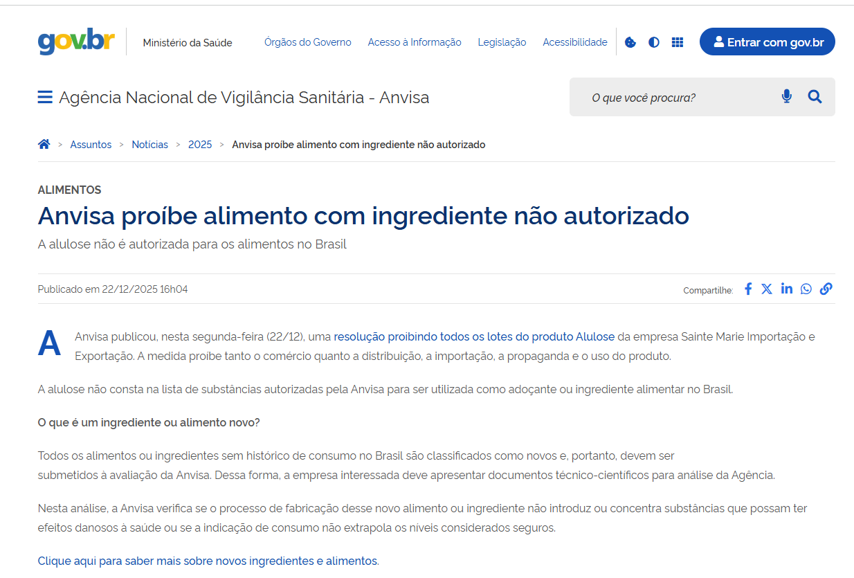 巴西国家卫生监督局(ANVISA)于2025年12月19日发布第5157号决议,明确禁止阿洛酮糖相关产品的销售、分销、进口、广告宣传及使用。究其原因,是该物质目前尚未在巴西获得食品用途的批准资质。