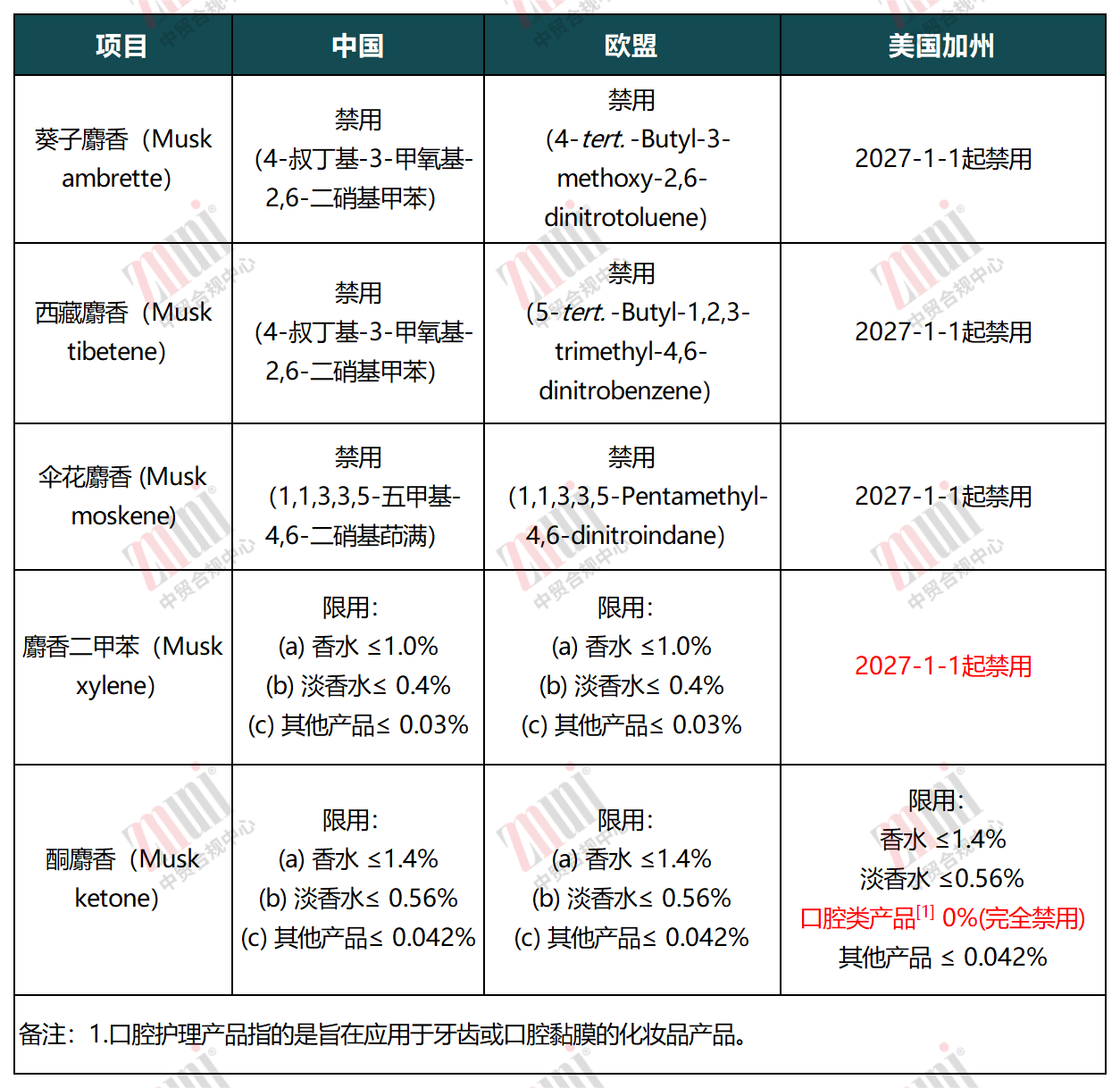 此次加州法案修订,也是美国加州与欧盟等国家地区相关法规接轨的一种标志,是越来越注重化妆品成分安全的体现。以下是中国、欧盟、加州对于这5种人造麝香的禁限用规定对比情况整理: