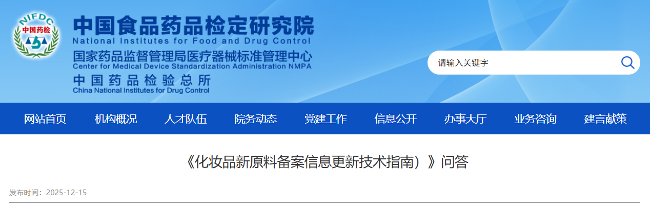 为指导新原料备案人规范开展相关工作,根据《条例》及相关法规文件要求,中国食品药品检定研究院组织制定了《化妆品新原料备案信息更新技术指南》(以下简称《指南》),明确了新原料备案信息更新资料提交技术要求和提交方式。