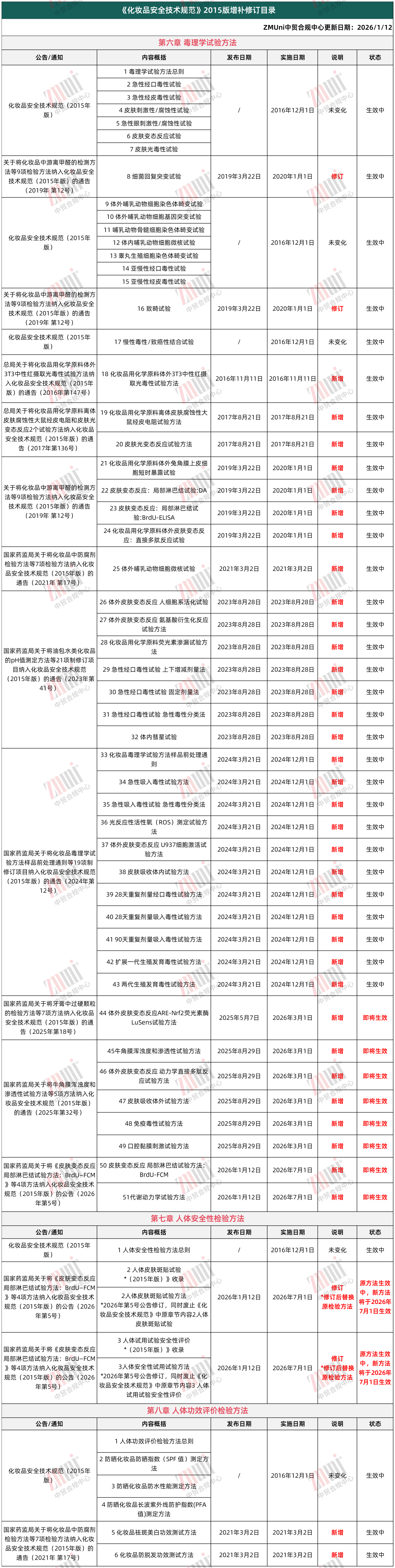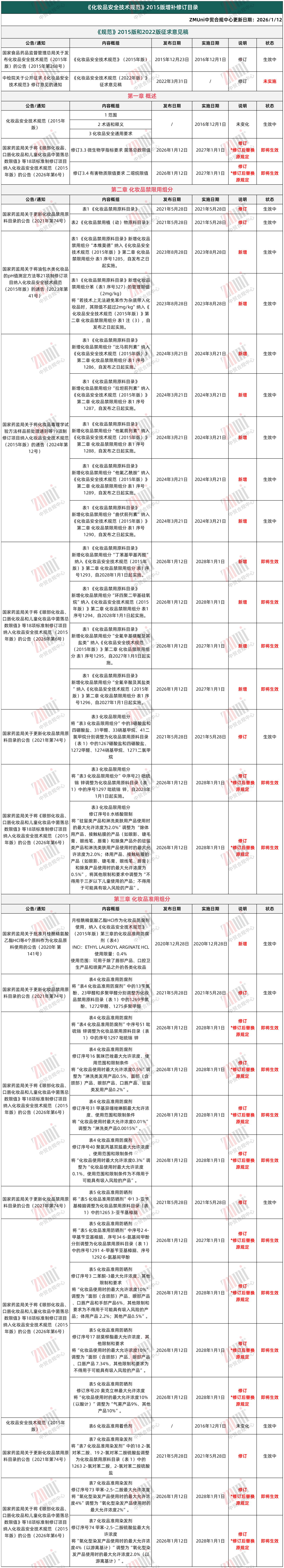 截止至2026年1月12日,《规范》又有哪些修订和增补呢?为了方便化妆品工作技术人员参考,ZMUni中贸合规中心整理了相关修订、增补情况,详见以下最新版目录: