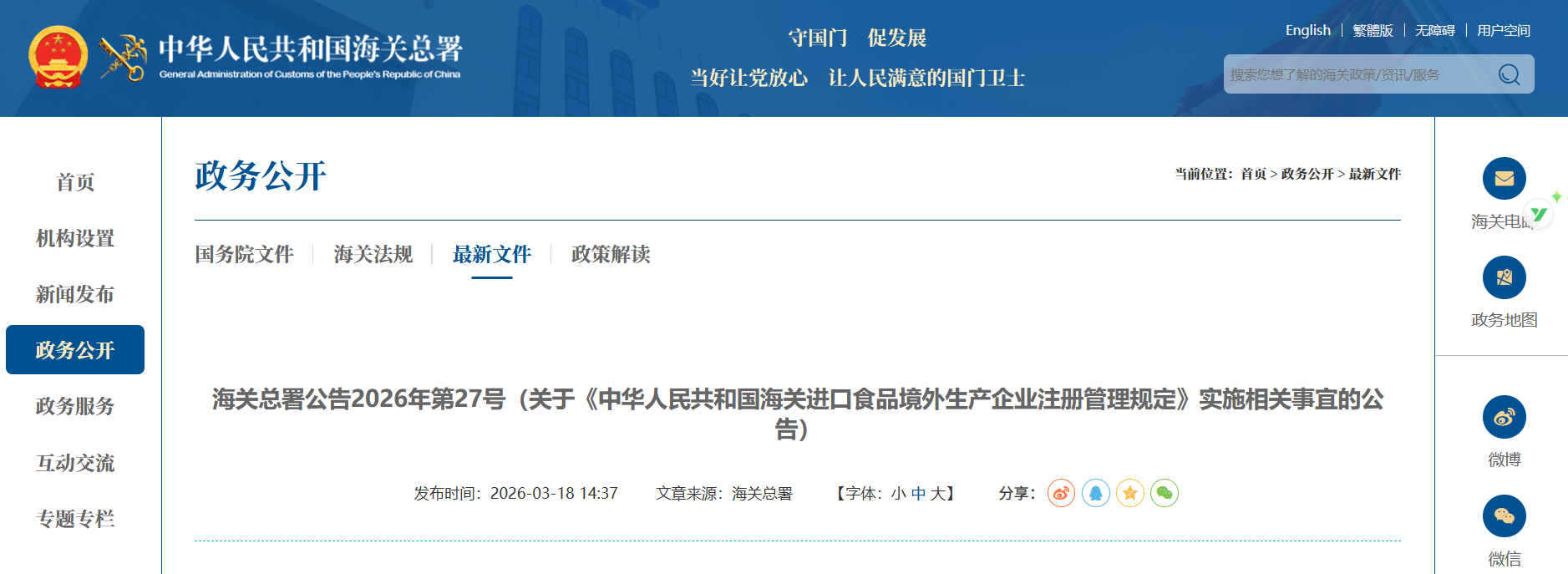 海关总署公告2026年第27号(关于《中华人民共和国海关进口食品境外生产企业注册管理规定》实施相关事宜的公告)