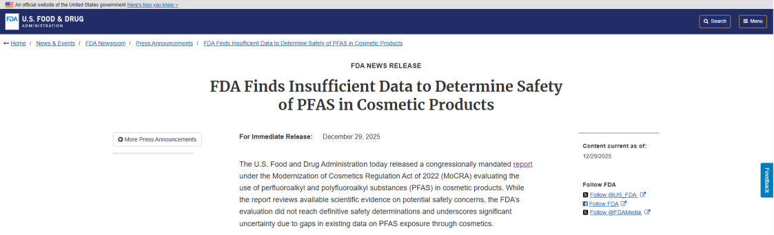 2025年12月29日,美国食品药品监督管理局(FDA)依据2022年《化妆品现代化监管法》(MoCRA)授权发布了一份报告,评估了全氟烷基和多氟烷基物质(PFAS)在化妆品中的使用情况。报告回顾了现有的科学证据,但目前关于PFAS通过化妆品暴露的数据存在空白,大多数PFAS的毒理数据不完整或不可得,存在重大不确定性,因此 FDA 未能就PFAS在化妆品中的使用安全性得出最终结论。