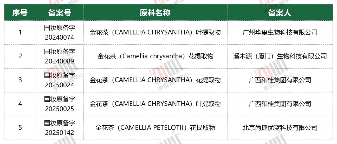 据查询,与金花茶相关的新原料备案信息有5款,分别为: