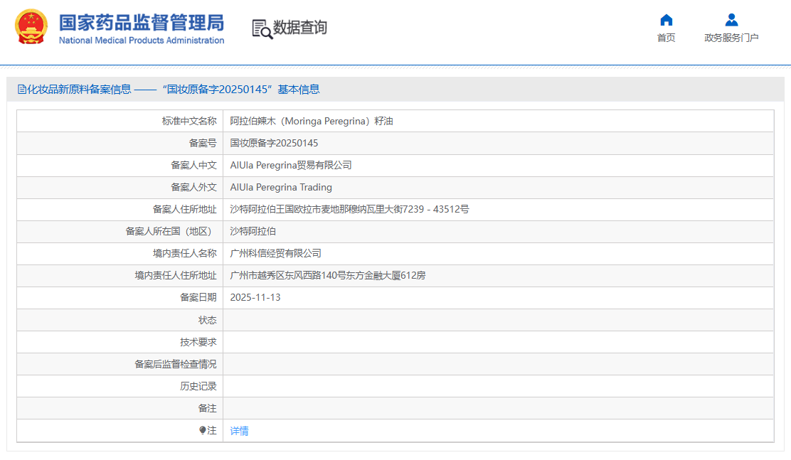 阿拉伯辣木(Moringa Peregrina)籽油(备案号:国妆原备字20250145),由AlUla Peregrina贸易有限公司备案。目前相关技术要求尚未披露,且尚未进入监测期。