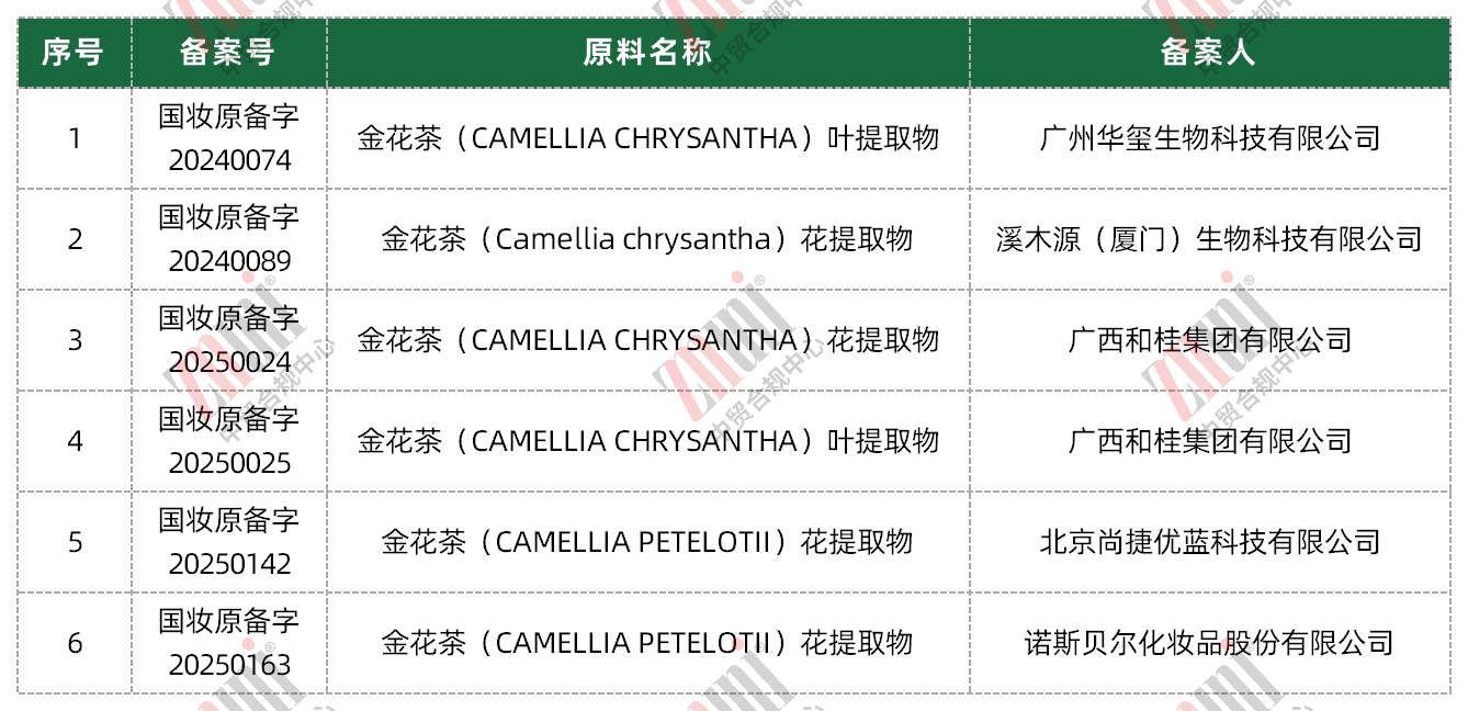 2025年12月17日,据国家药监局公示平台显示,金花茶(CAMELLIA PETELOTII)花提取物完成化妆品新原料完成备案,进入公示阶段。